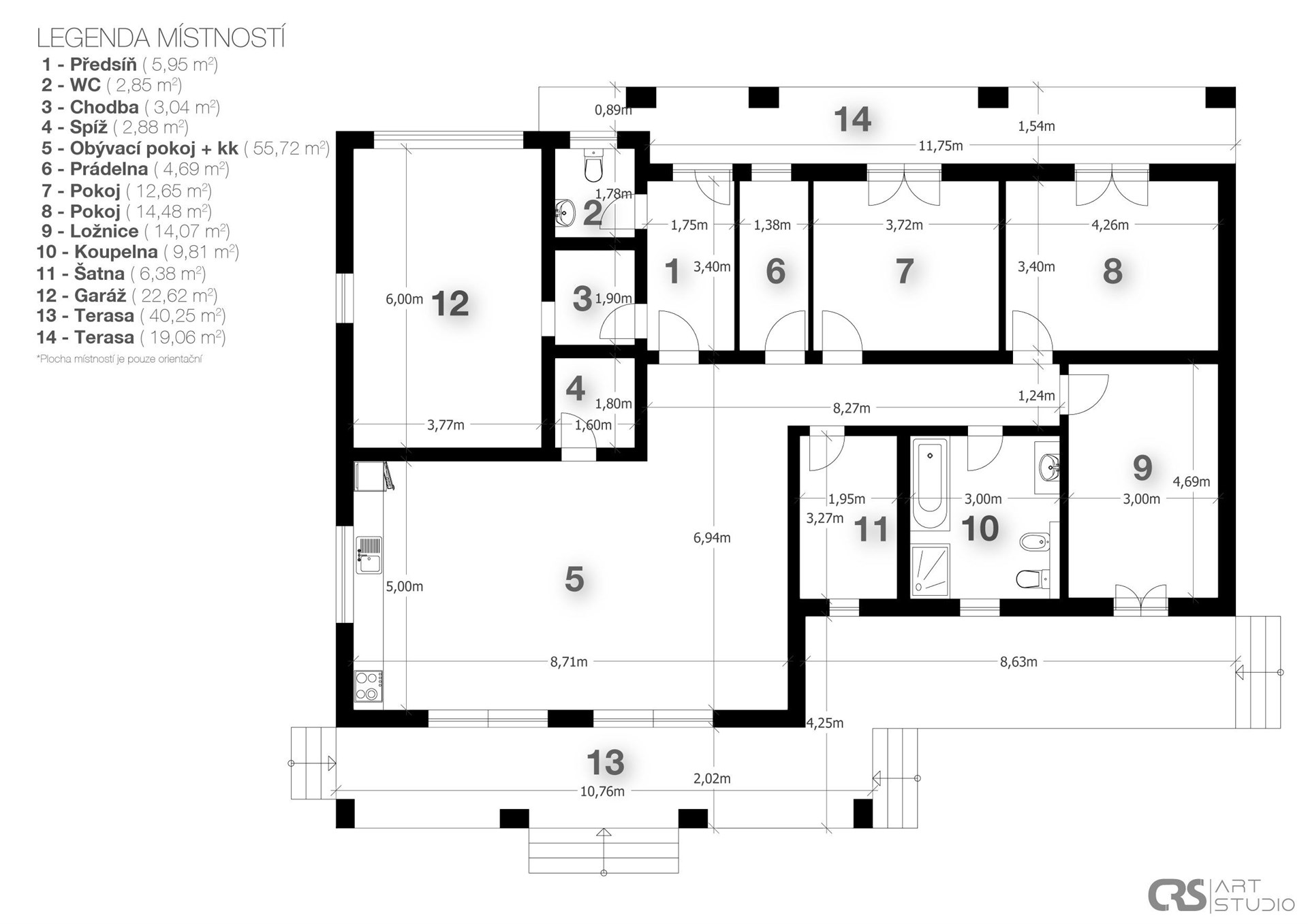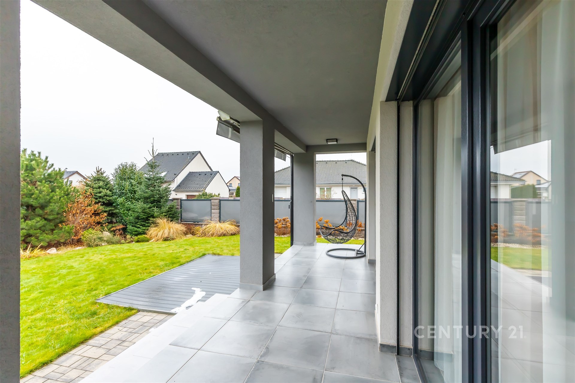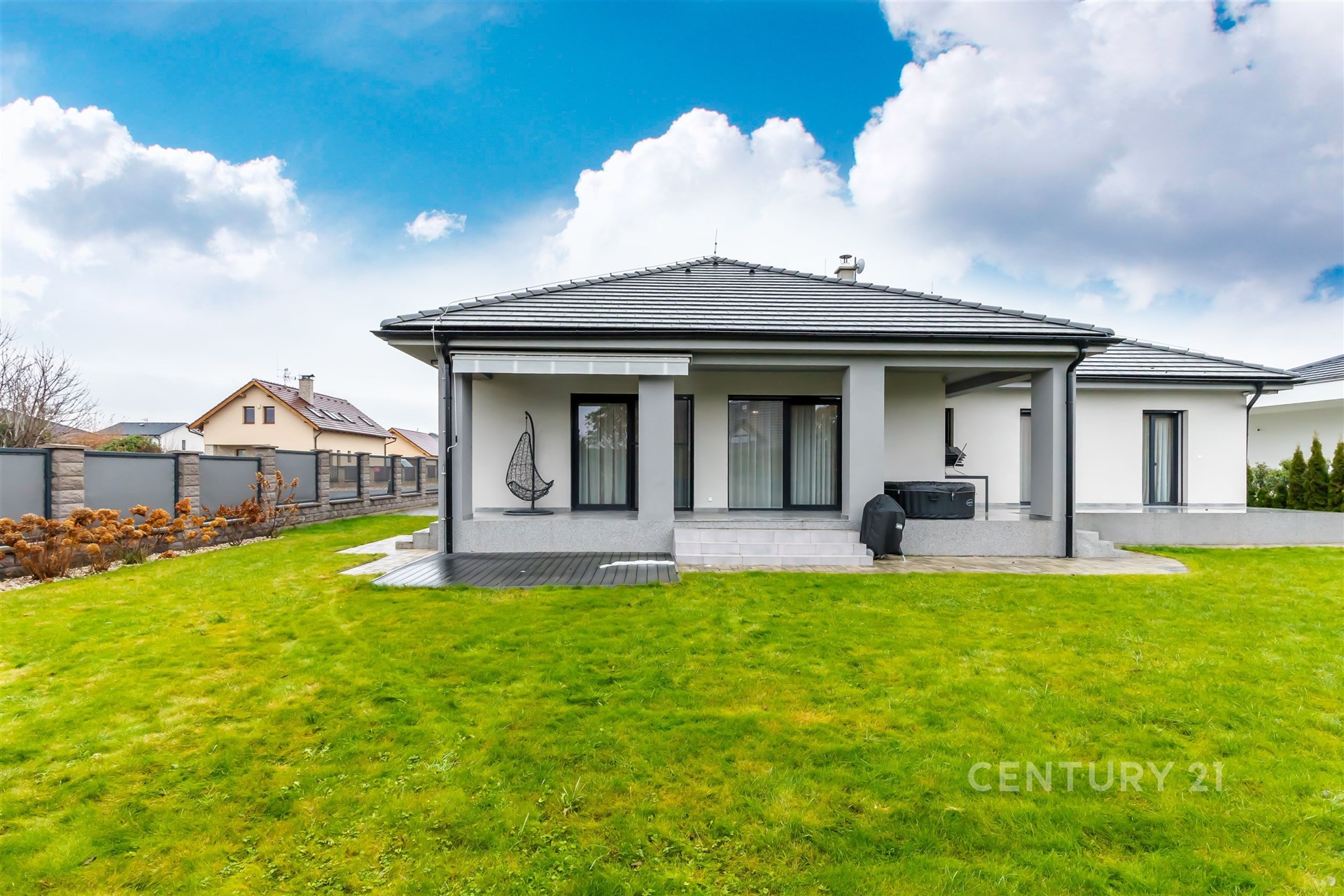 Vaše rodina se může setkávat ve velkorysém obývacím pokoji s nadstandardně vybaveným kuchyňským koutem a spíží. Z obývacího pokoje můžete vstoupit na krytou jižně orientovanou terasu, která s rozlohou 60 m2 poskytuje dostatek prostoru pro venkovní posezení a grilování.