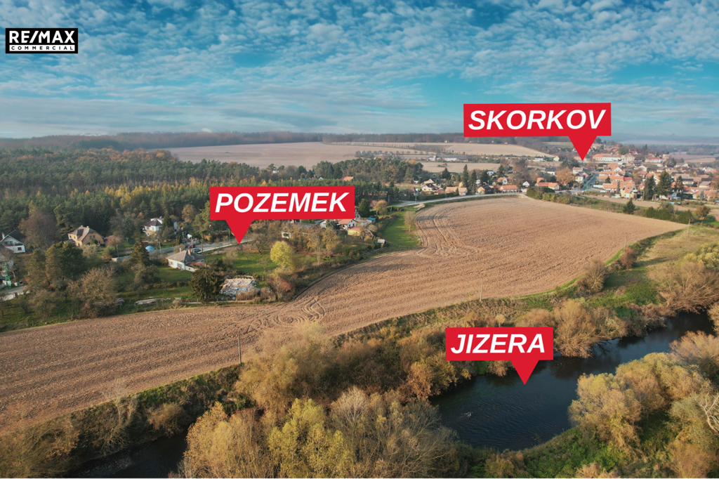 Pozemek se nachází v srdci obce Skorkov, okolí tvoří vesnická zástavba. Přímo z něj je výhled na řeku Jizeru, navzdory tomu je mimo záplavové území. Pár metrů chůze od pozemku se nachází rozlehlé lesy, plné turistických tras a cyklotras. V obci funguje například obchod, úřad, hospoda, hřbitov a množství hřišť. Z vesnice je dále výborná dostupnost do okolních měst. Autem jste na dálnici za 5 minut, což umožňuje snadnou cestu do Prahy nebo do Mladé Boleslavi, kam se dostanete za dalších 15 minut. Obec je také dobře spojena autobusovými linkami do Benátek a Staré Boleslavi.