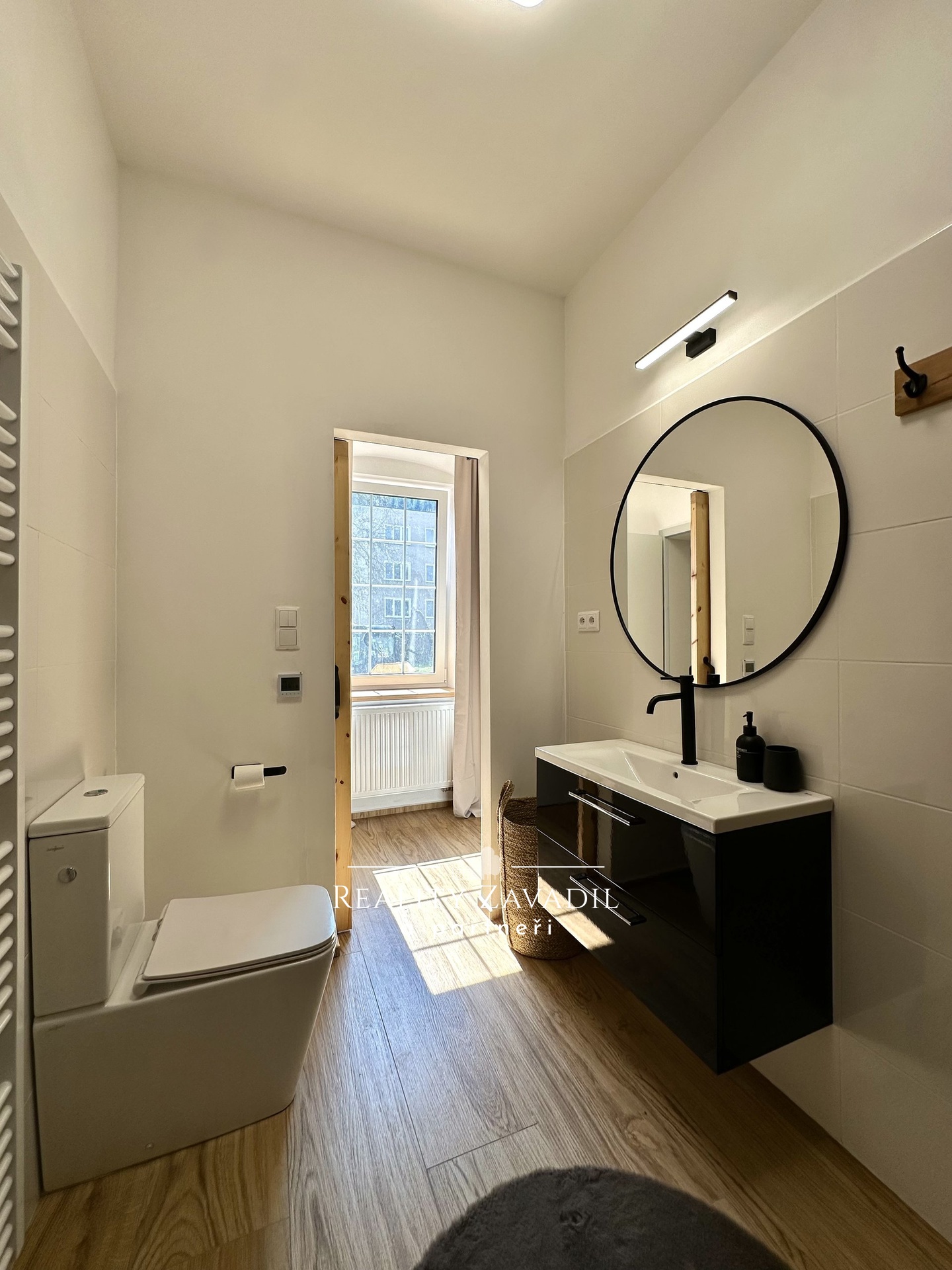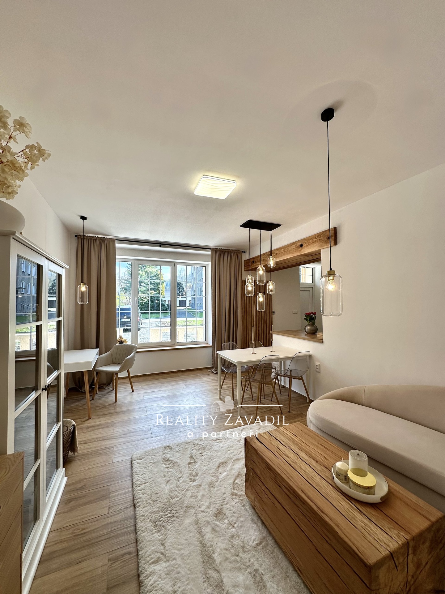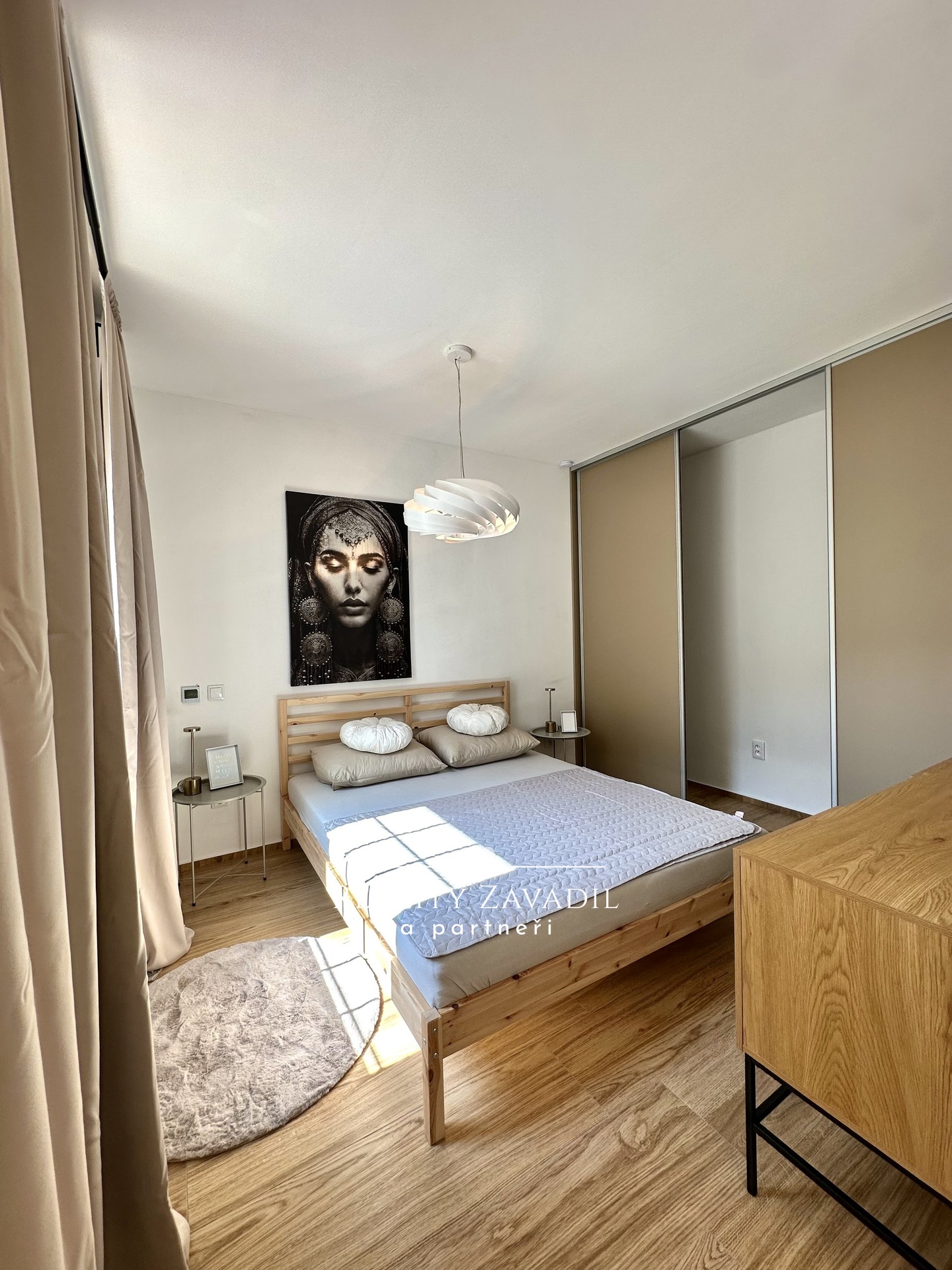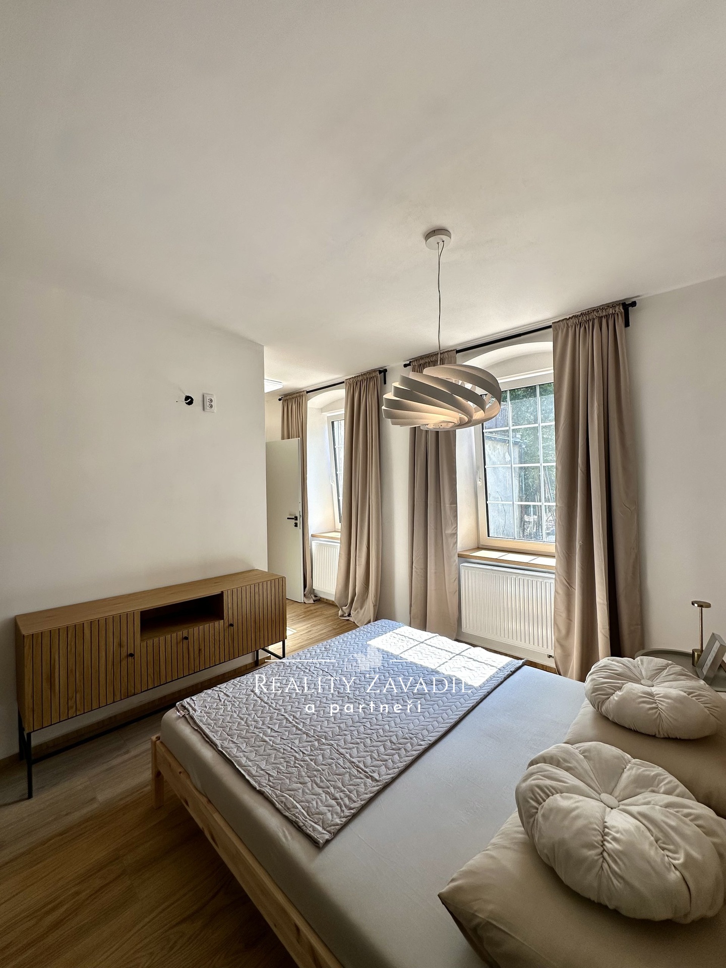 Interiér bytu je navržen v moderním skandinávském stylu s důrazem na kvalitu materiálů a praktické využití prostoru. Obytná část plynule propojuje obývací pokoj s jídelnou a kuchyňským koutem, který je kompletně osazen vestavnými spotřebiči. Prostoru dominují designové prvky v podobě přiznaných stropních trámů a masivních posuvných dveří. Ložnice je vybavena manželskou postelí a dostatečnými úložnými prostory. Koupelna disponuje velkoformátovým sprchovým koutem a moderní sanitární keramikou. Byt se prodává s veškerým zobrazeným vybavením a nevyžaduje žádné další počáteční investice.