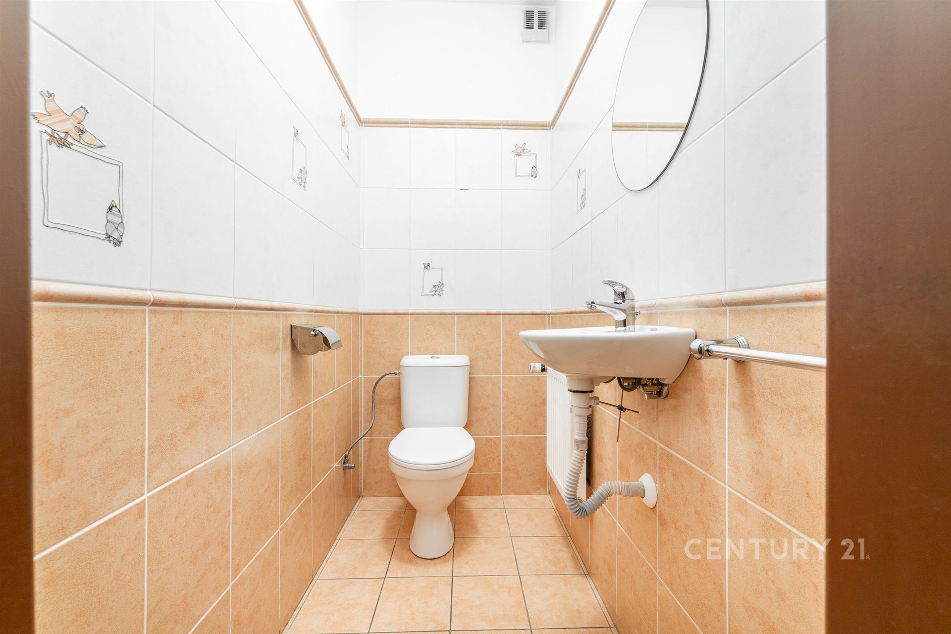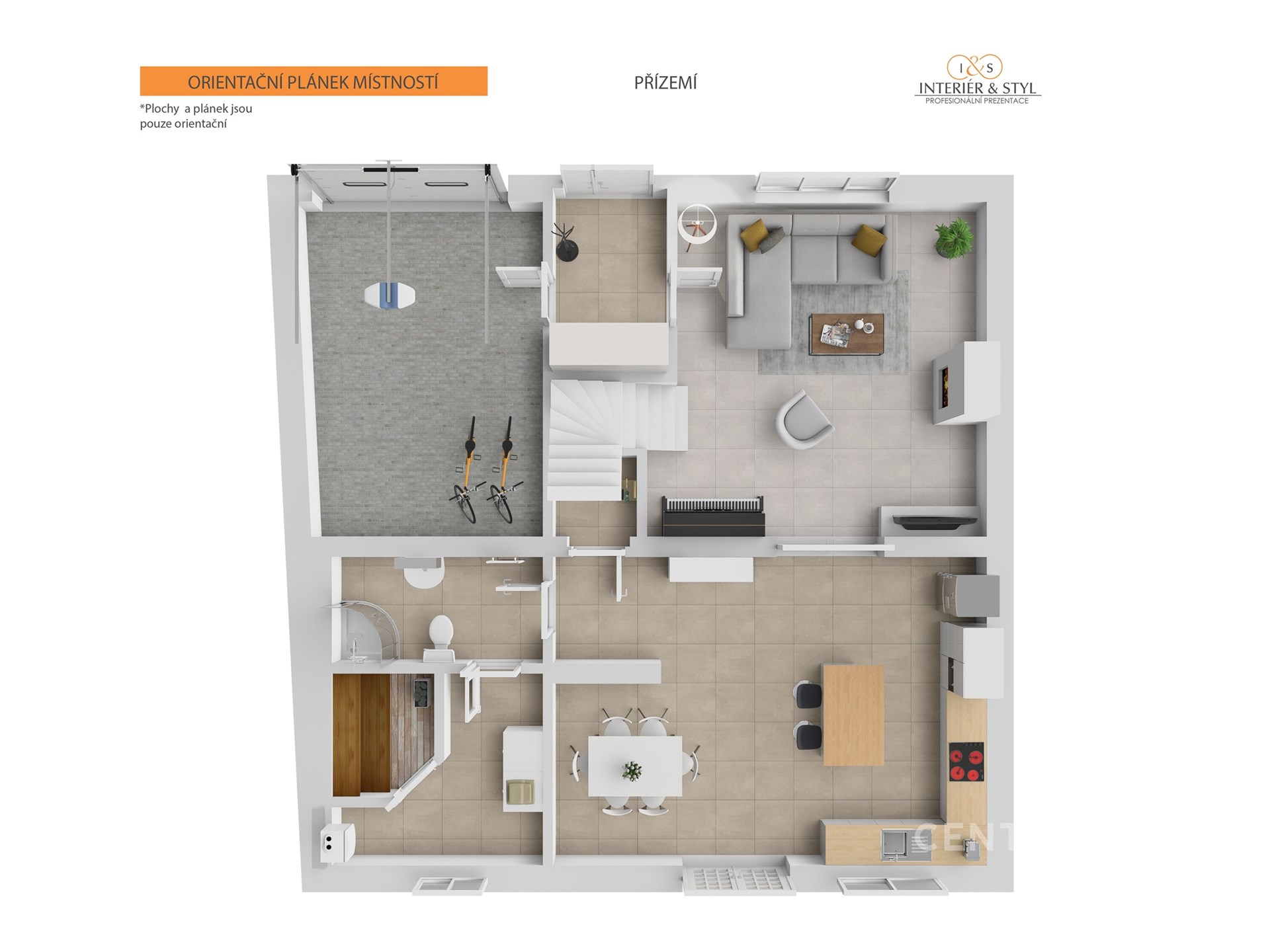 Přízemí (Denní a relaxační část): Srdcem domova je prostorný obývací pokoj s krbem a schodištěm navazující na prostornou kuchyni s jídelním koutem a praktickou spíží. Z kuchyně je přístup do koupelny se sprchovým koutem a WC a saunou, která nabízí dokonalý odpočinek po náročném dni. Z kuchyně vedou dveře na terasu s krbem a bazénem. Z předsíně je přístup do garáže.