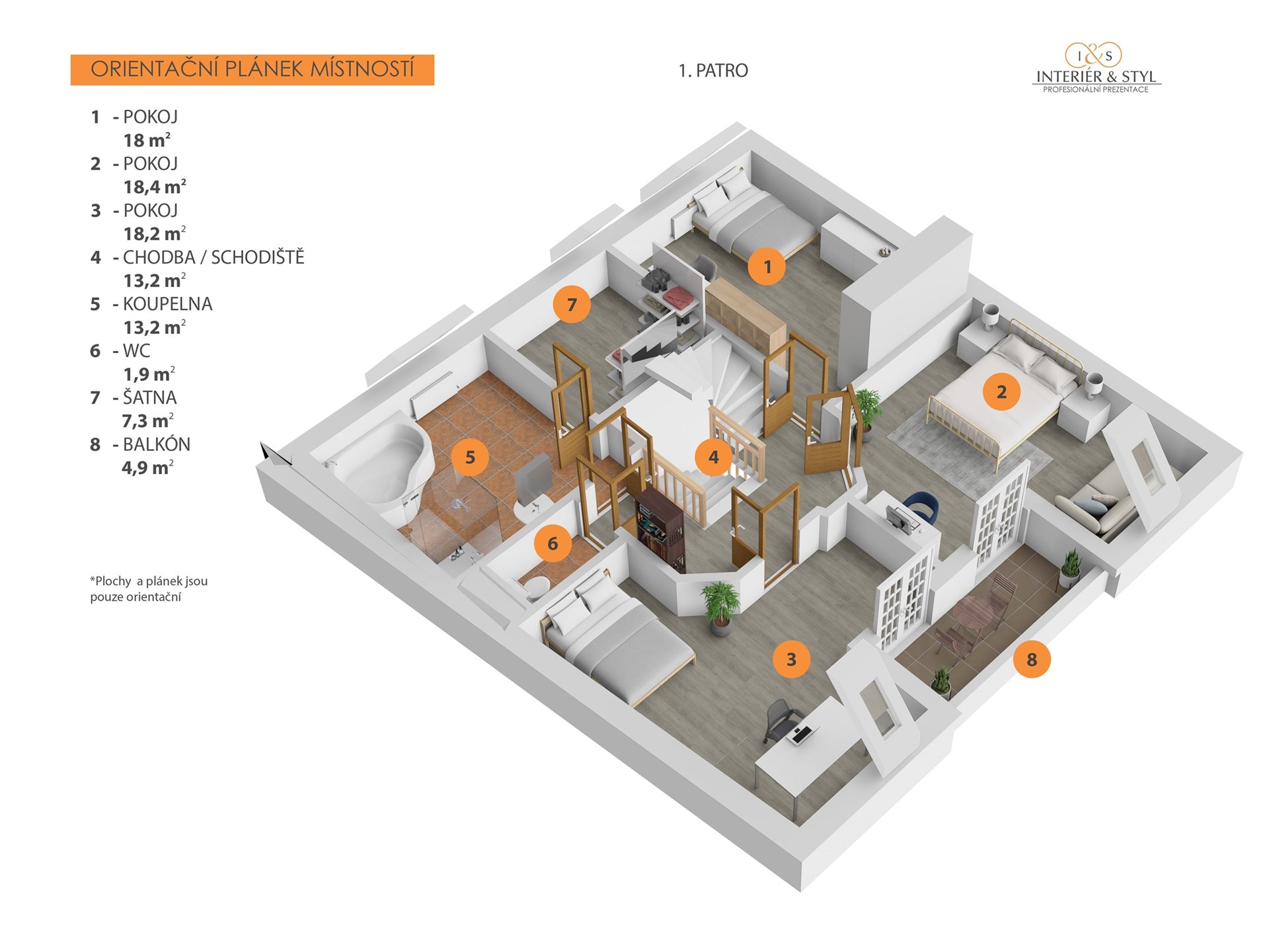 1. patro (Soukromá část): Zde se nacházejí 3 samostatné pokoje (ložnice/dětské pokoje), šatna pro maximální úložný prostor a prostorná koupelna vybavená jak vanou, tak sprchovým koutem. Toaleta je oddělená pro vyšší komfort obyvatel. Dva z pokojů mají společný balkon.