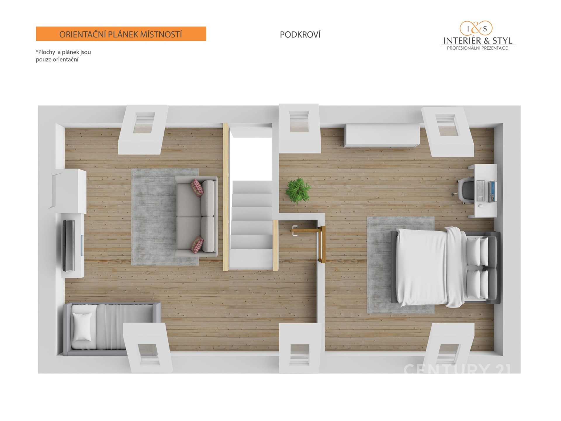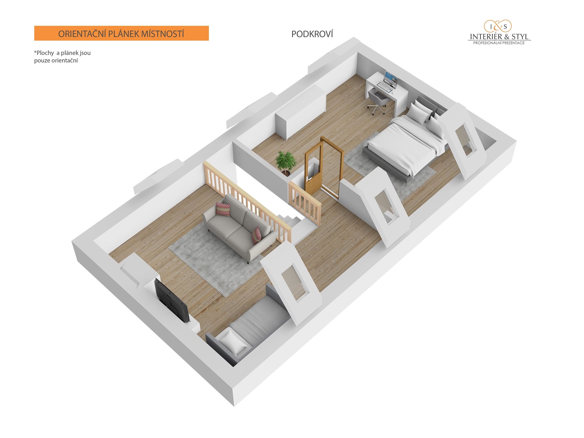 Podkroví (Variabilní prostor): Unikátní podkrovní prostor tvoří otevřená galerie (openspace), přes kterou se vstupuje do dalšího samostatného pokoje. Tento prostor je ideální jako pracovna, herna nebo ateliér.