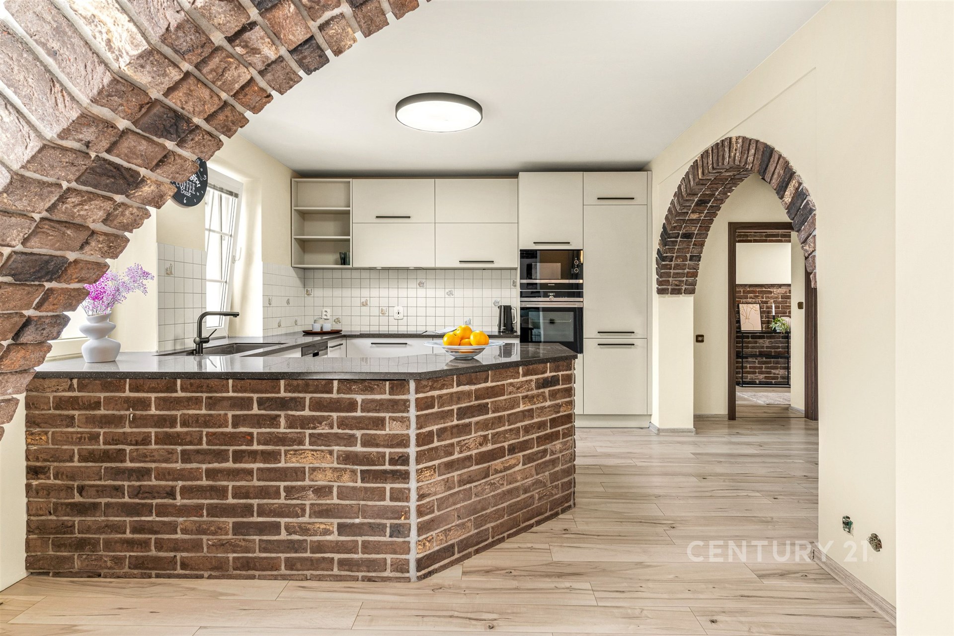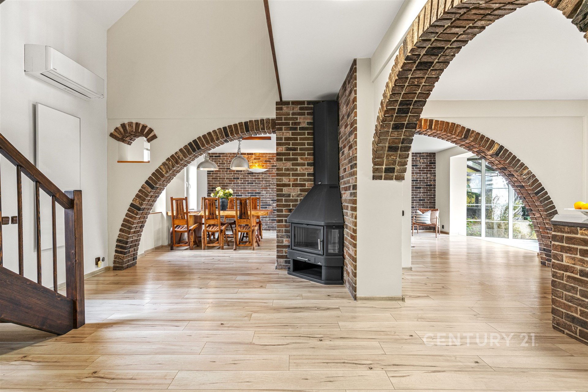 Po vstupu vás přivítá prostorná chodba, která vás zavede do srdce domu – velkorysé kuchyně pod cihlovým obloukem. Ta je propojená s obývacím pokojem, kde si můžete užívat rodinné večery u plápolajícího krbu. V přízemí nechybí koupelna ani vstup do garáže pro dva vozy.