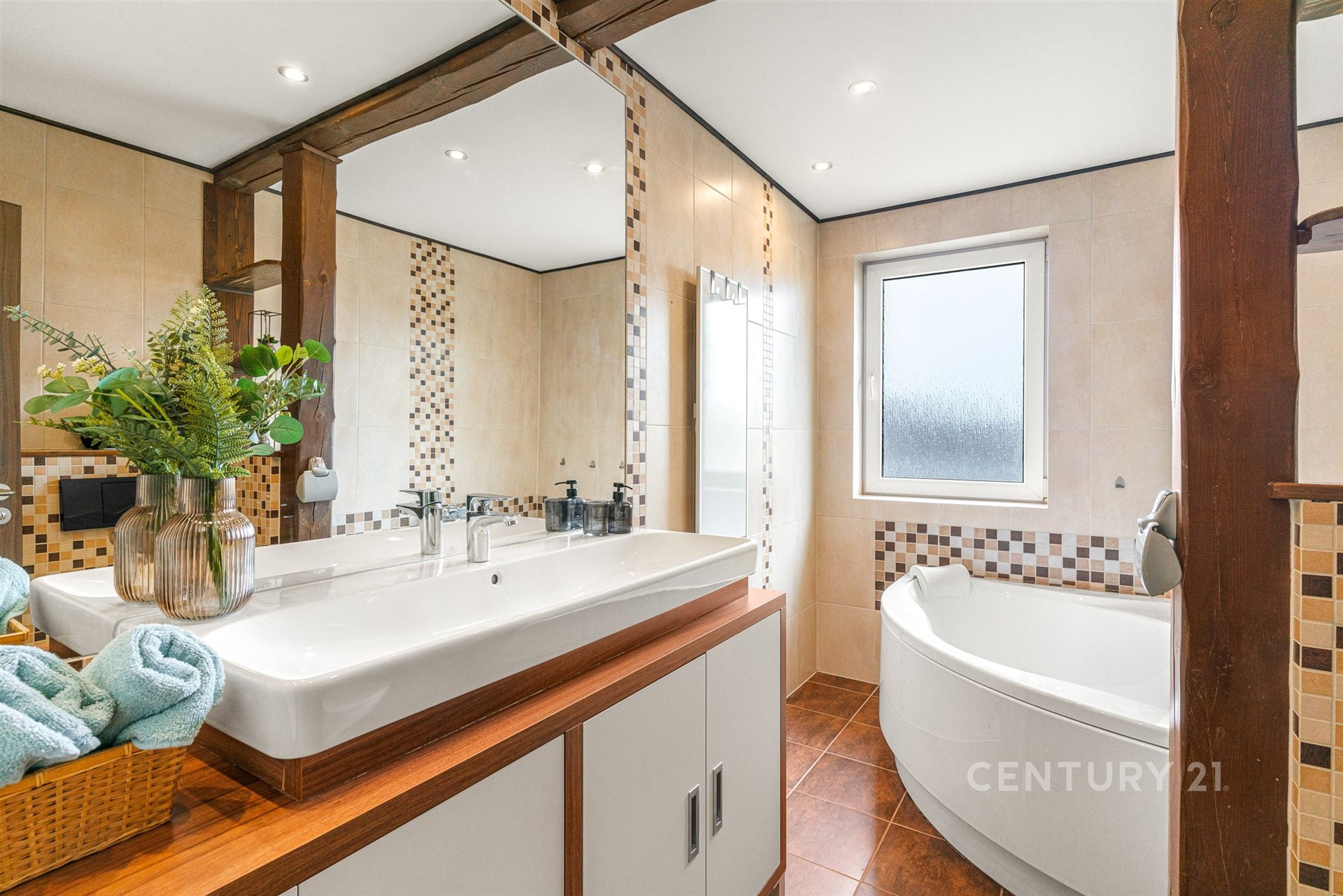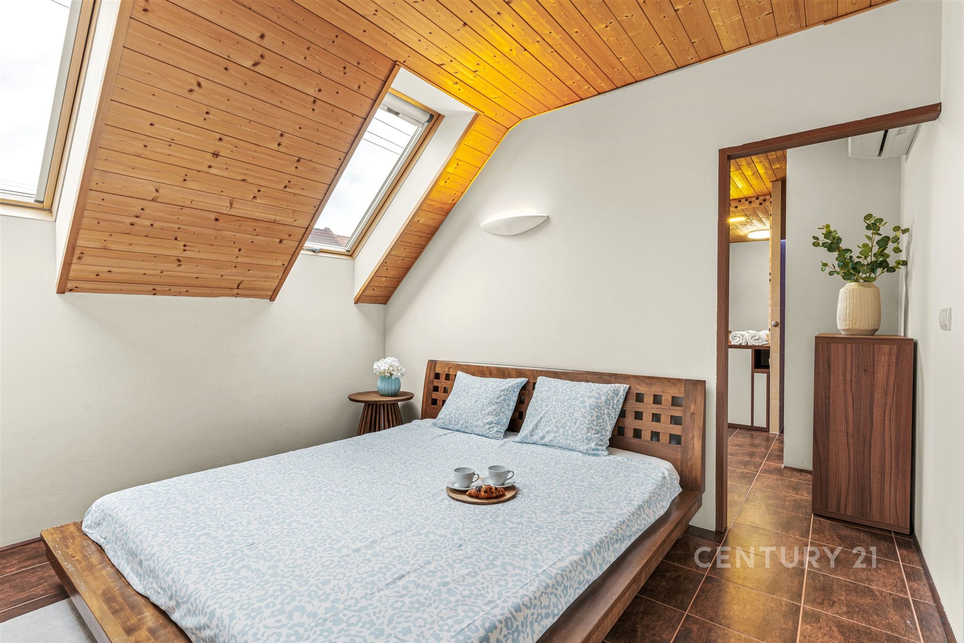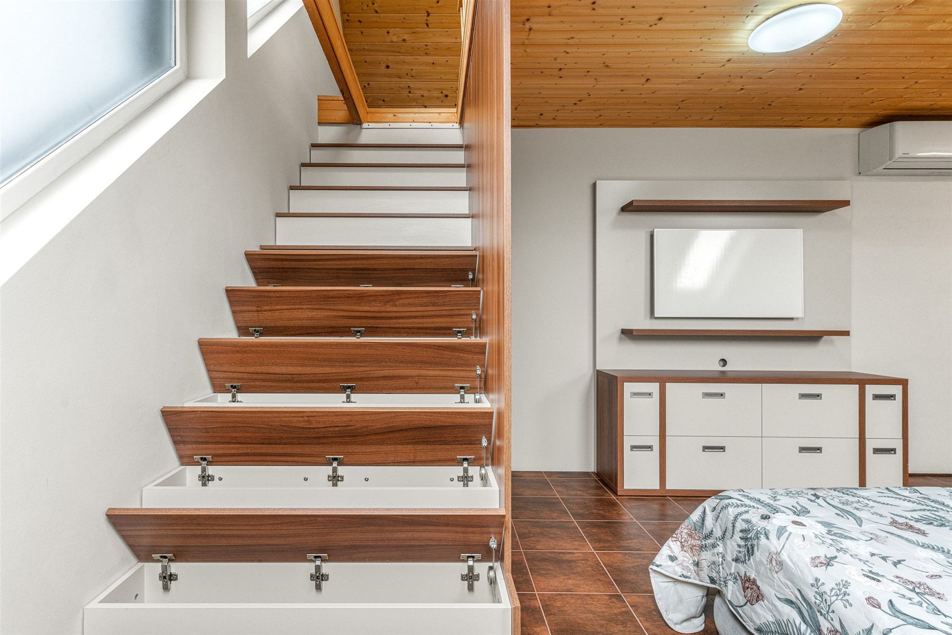 V patře na vás čeká pět pokojů, dvě koupelny a útulný půdní koutek. Díky této dispozici je dům ideální nejen pro velkou rodinu, ale i pro ty, kdo potřebují prostornou a plně oddělenou domácí kancelář. Vše doplňují vestavěné skříně a praktické úložné prostory šikovně ukryté v každém rohu.