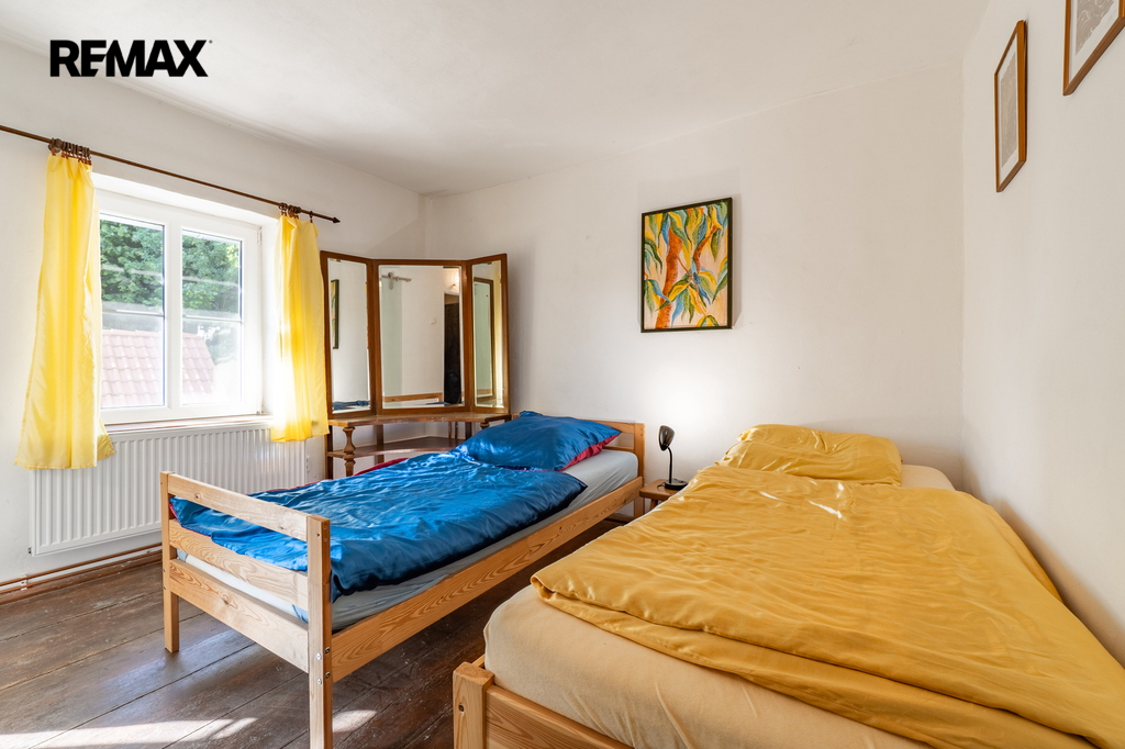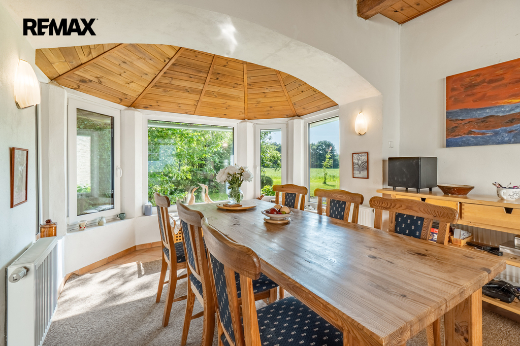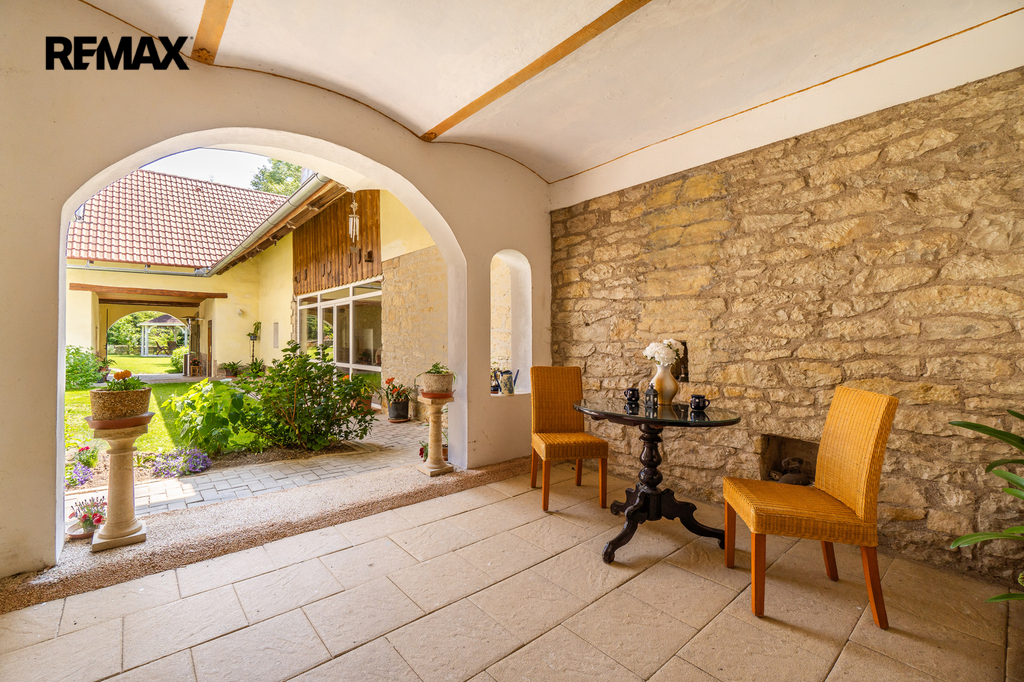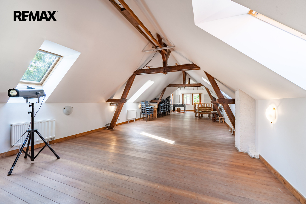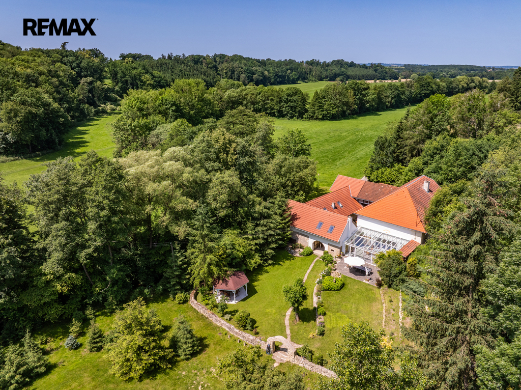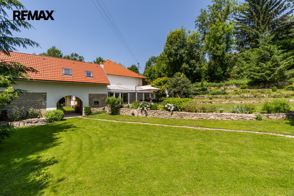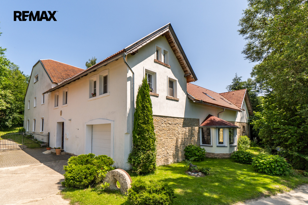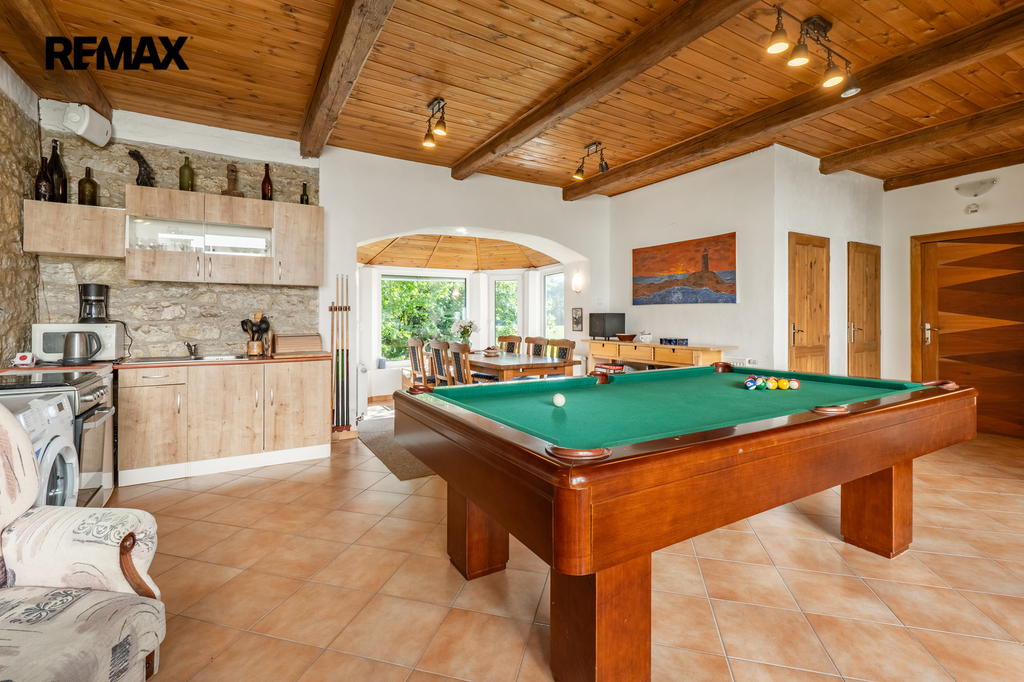 Celková užitná plocha činí 786,1 m² a nabízí mimo jiné i sál vhodný pro pořádání větších akcí. Nechybí dvě garáže s dostatkem místa pro techniku i vozidla. Ať už hledáte nové rodinné zázemí nebo výjimečné místo pro podnikání v souladu s přírodou, tato nemovitost vám dá prostor pro obojí. Dům má kamenné základy a využíván je také sklepní prostor přístupný z prostorné obývací haly, vedle kuchyňského koutu.