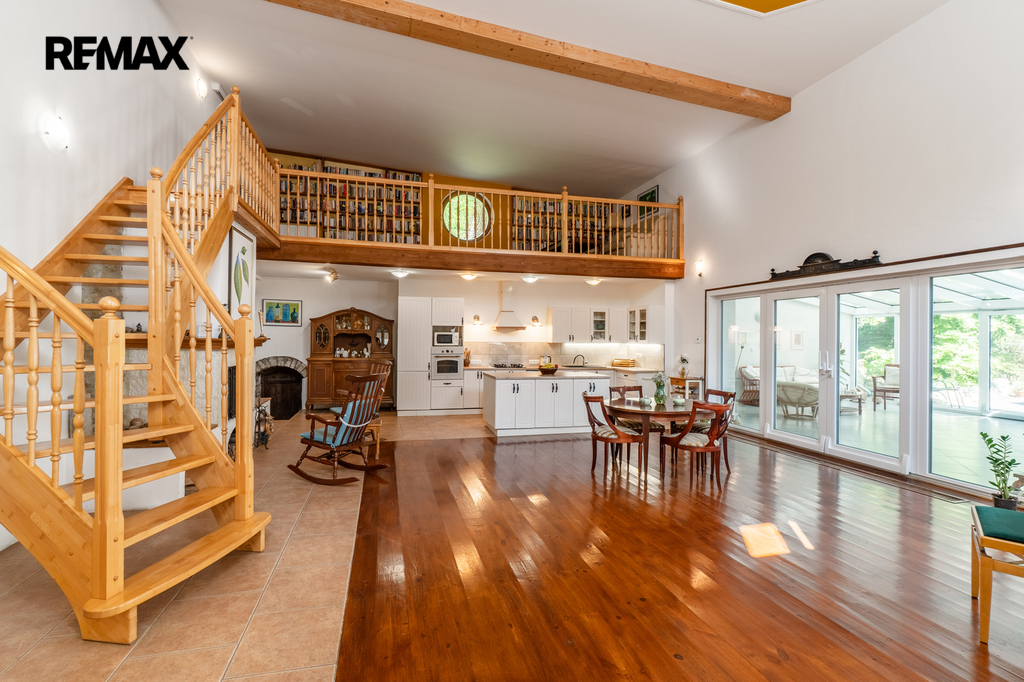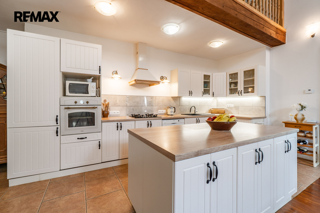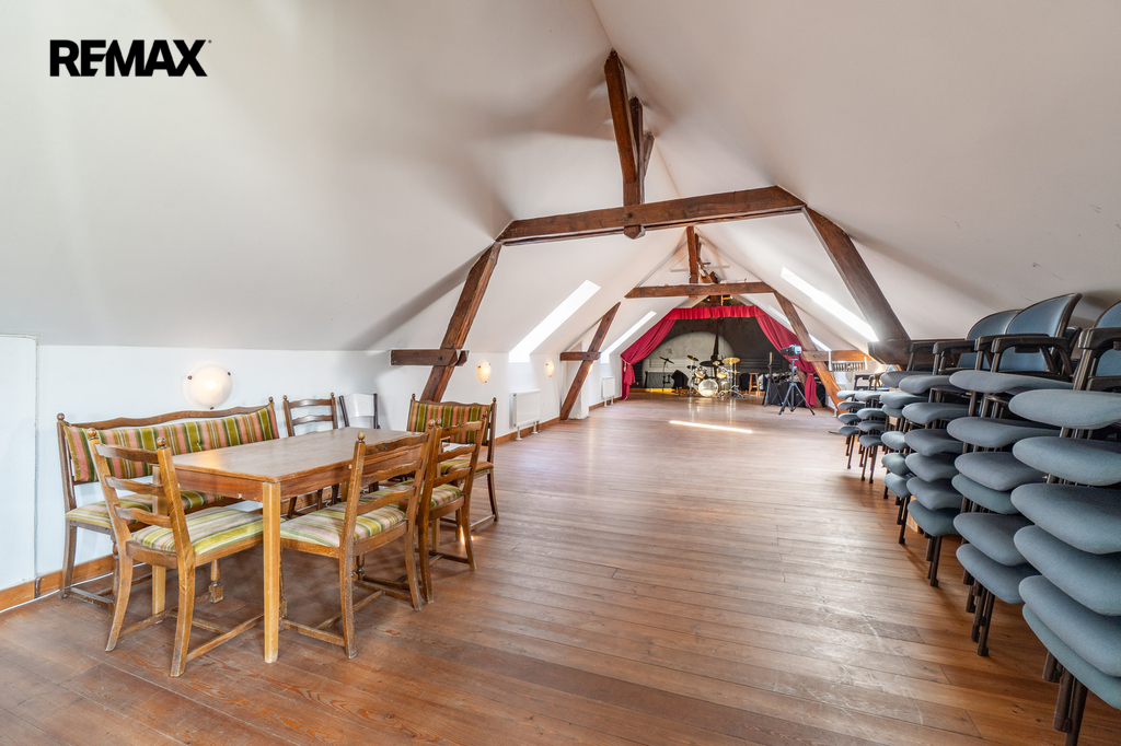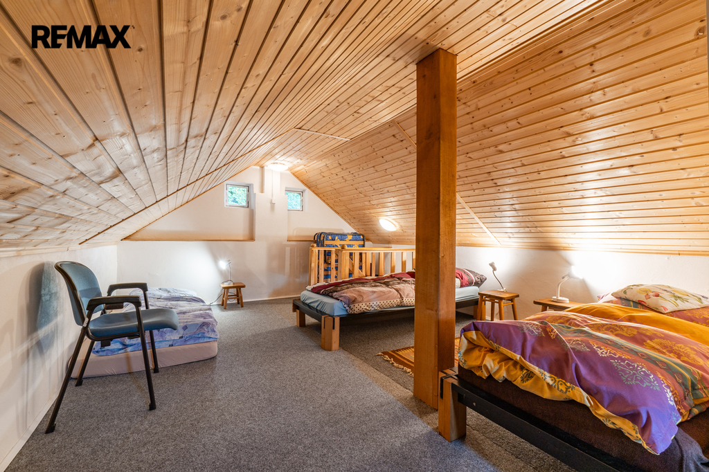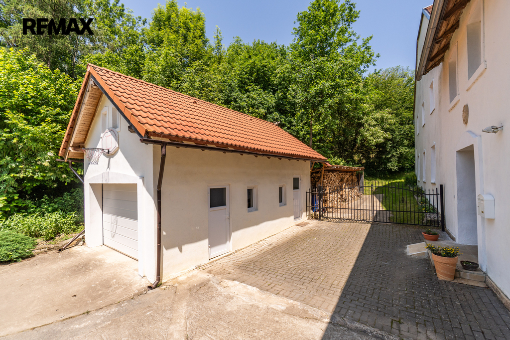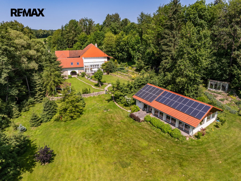 Celková užitná plocha činí 786 m² a nabízí mimo jiné i sál vhodný pro pořádání větších akcí. Nechybí dvě garáže s dostatkem místa pro techniku i vozidla. Ať už hledáte nové rodinné zázemí nebo výjimečné místo pro podnikání v souladu s přírodou, tato nemovitost vám dá prostor pro obojí. Dům má kamenné základy a využíván je také sklepní prostor přístupný z prostorné obývací haly, vedle kuchyňského koutu.