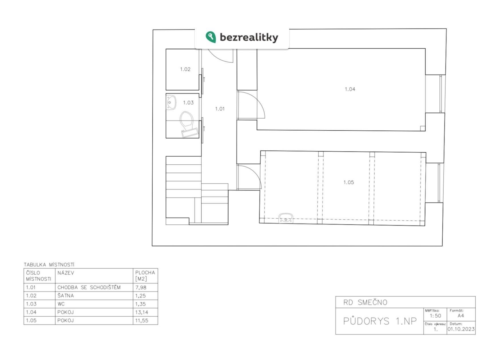 Přízemí: obývací pokoj s kuchyňským koutem, další pokoj, samostatné WC a prostor ideální pro koupelnu, šatnu nebo technické zázemí