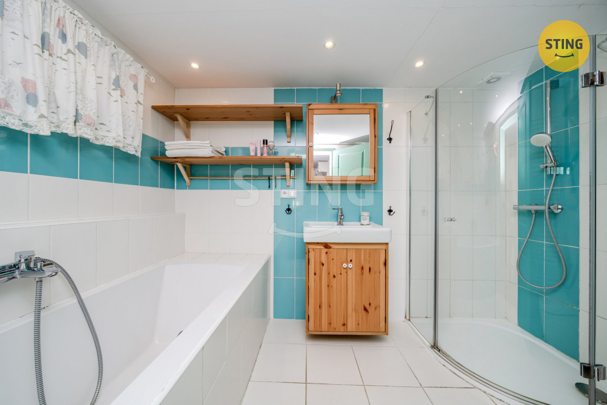 Dispozice: 1. NP: Po průchodu kouzelnou, dřevěnou verandou se dostaneme do zádveří (7,45 m2) domu s odkládací stěnou na míru, v oblíbeném provance stylu. Nalevo se nachází koupelna s vanou + sprchovacím koutem + WC (6,04 m2). Napravo pak komora (1,88 m2) a schodiště do patra z chodby (6,90 m2). Na konci chodby se nachází vstup do kuchyně s jídelním prostorem (12,89 m2) a za ním dětský pokoj (15,46 m2). Dalším vstupem z chodby se dostaneme do slunného obývacího pokoje (18,35 m2), kde je možnost zřízení krbových kamen, které by dodaly romantickou atmosféru a podtrhly tak útulnost domova. Poslední místností je pak ložnice (9,05 m2), do níž se vstupuje z obývacího pokoje. Oba pokoje jsou díky velkým oknům nádherně prosvětlené a nabízí výhled na udržovanou zahradu.