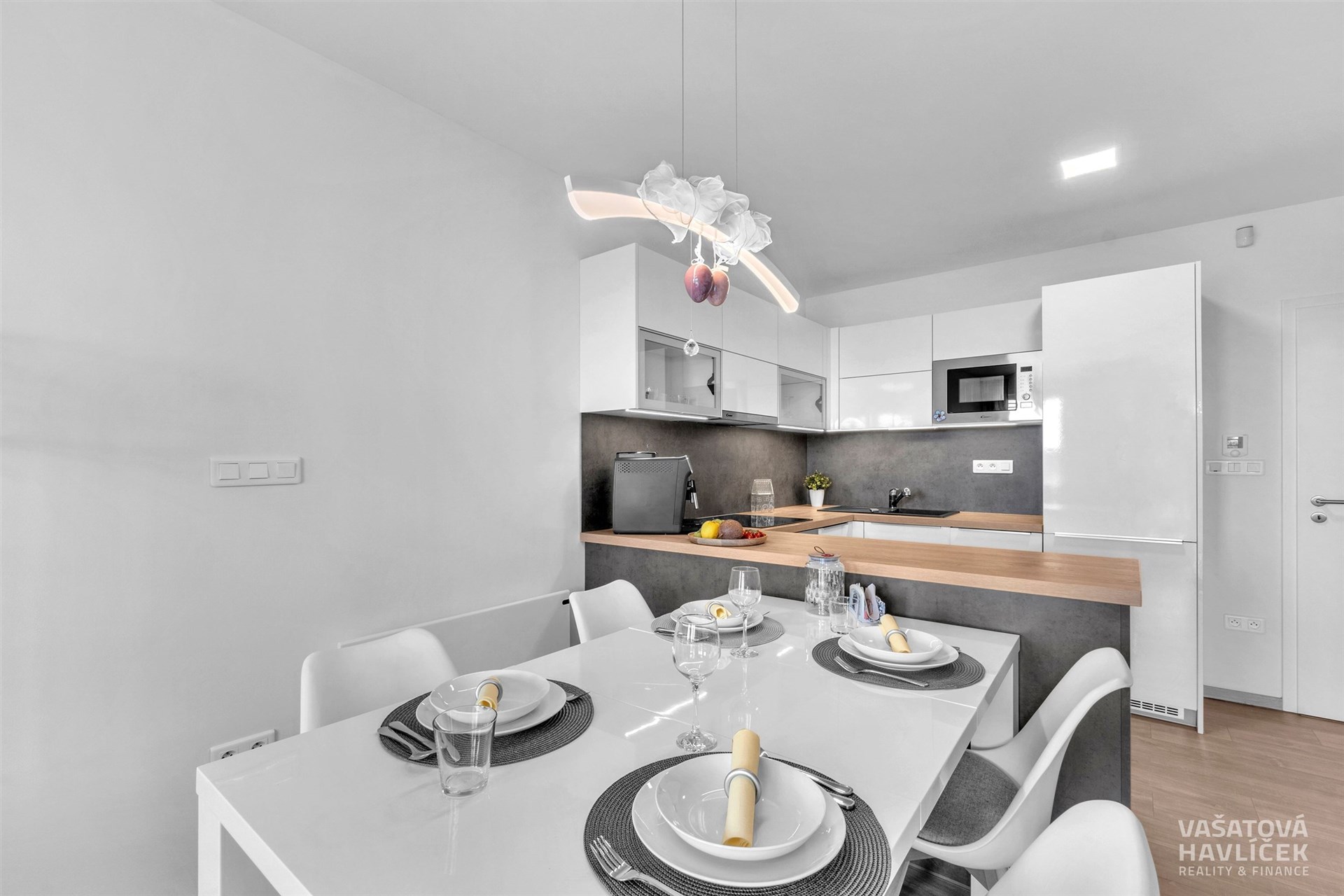 > kuchyňská linka s vestavěnými spotřebiči (trouba, indukční deska, myčka, lednice, mikrovlnná trouba, digestoř)
