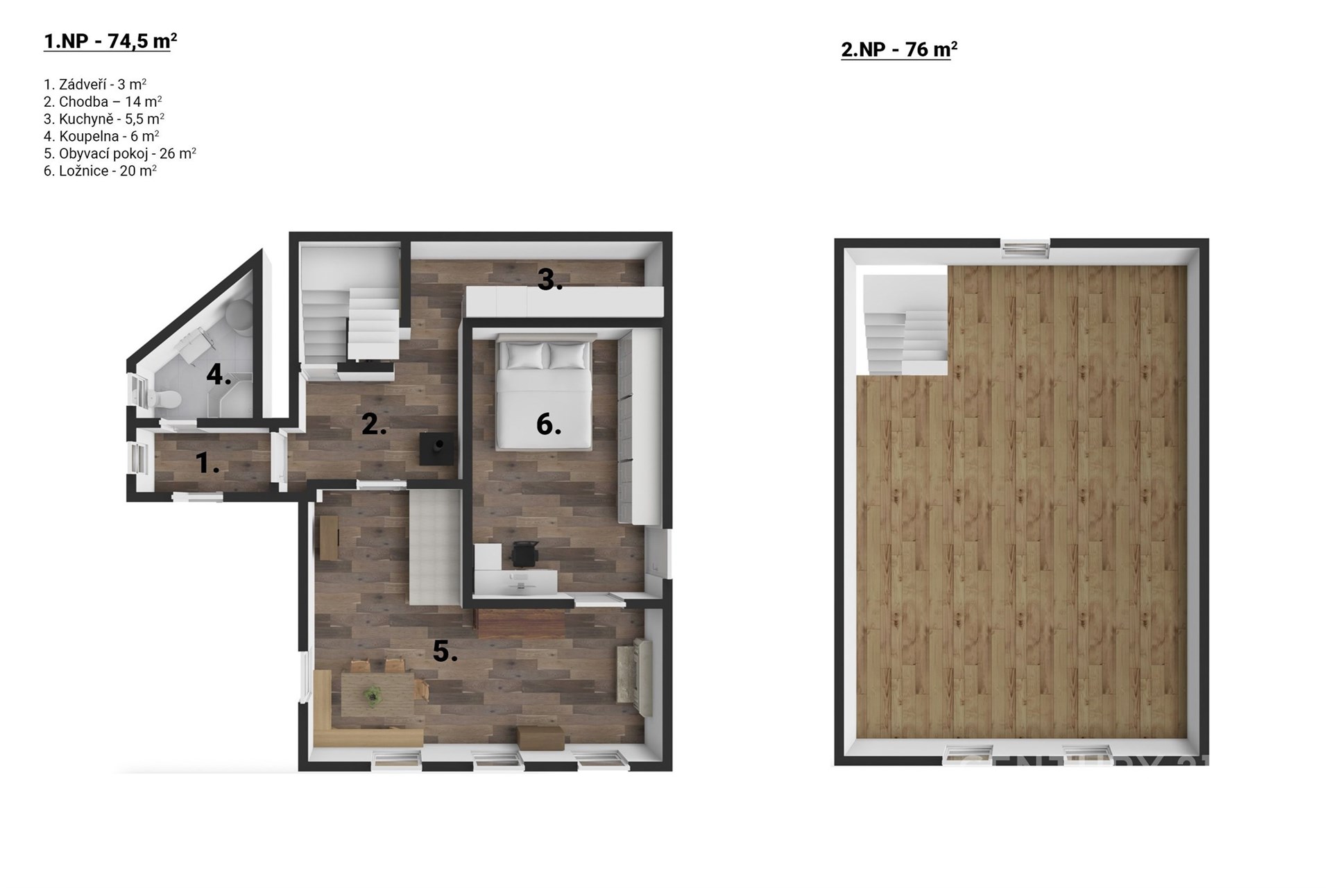 Dům má dvě nadzemní podlaží s celkovou užitnou plochou 150 m². V přízemí se nachází koupelna, kuchyně, ložnice a také srdce celého domu – prostorná místnost spojující obývací pokoj s jídelnou. Její dominantou je krb, který nejen efektivně vytápí interiér, ale také vytváří hřejivou atmosféru domova – ideální pro klidné zimní večery strávené v teple a pohodlí.