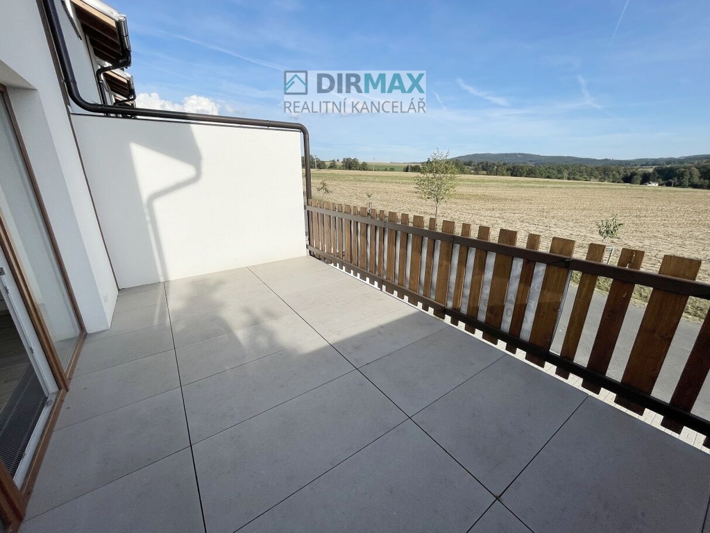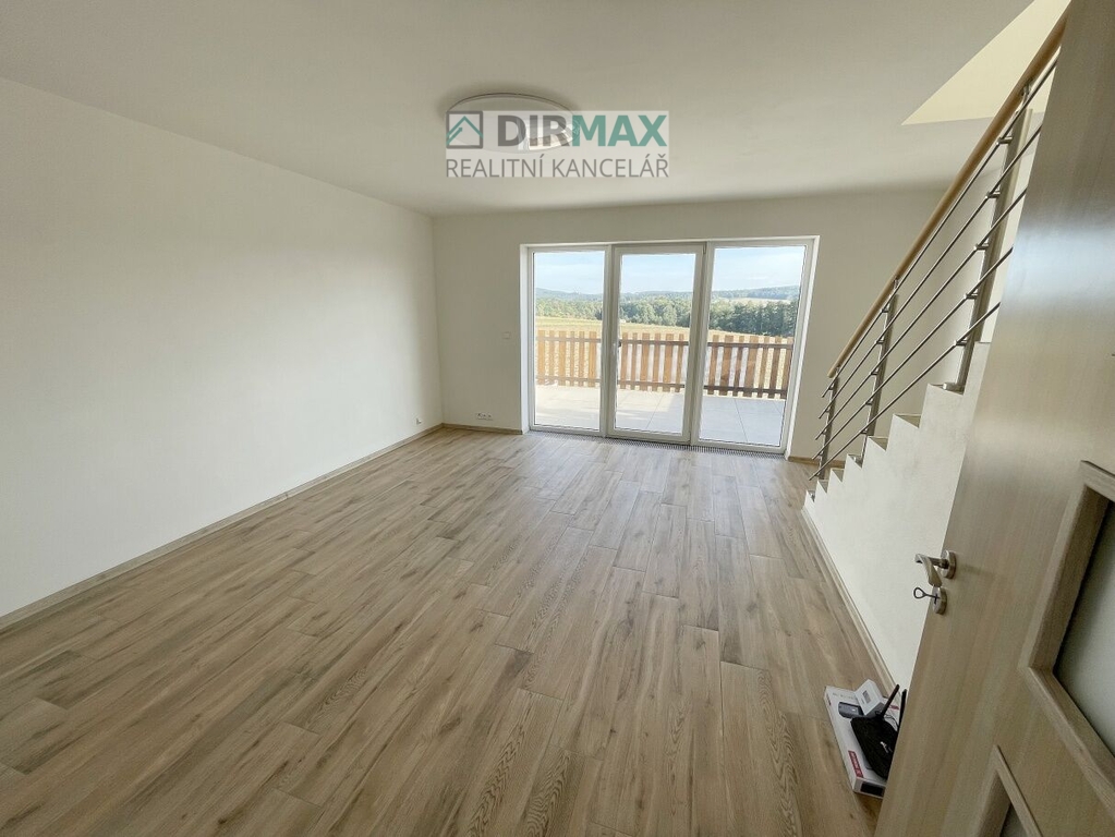 Další vstup je do velké místnosti fungující jako obývací prostor se vstupem na terasu s krásným, panoramatickým výhledem na okolí a CHKO Brdy. Soukromí je zajištěno betonovou zdí, směrem k sousedům. Terasa má vlastní odvodnění. Velká okna s tzv. francouzskými dveřmi zajišťují dostatek světla po celý den. Pod okny jsou vytápěcí rošty, zábrana před rosením.