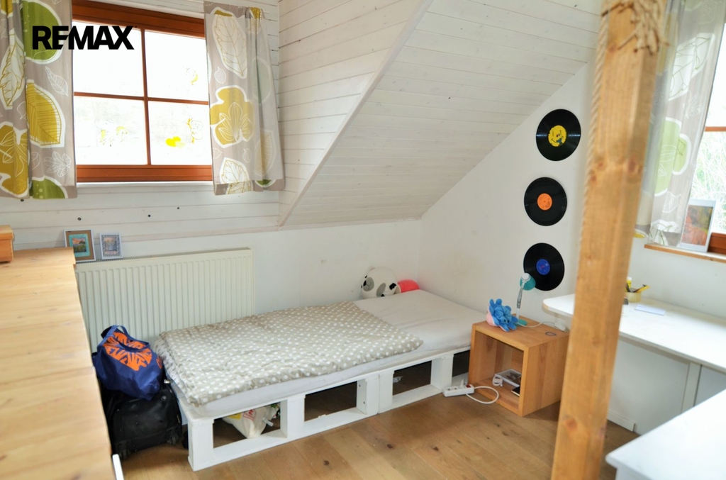 Dům má v přízemí velký rodinný prostor s kuchyní a jídelnou, kout s pracovnou/knihovnou, dále je v přízemí ložnice a koupelna s WC a pračkou. V horním patře jsou 3 dětské pokoje a druhé WC.