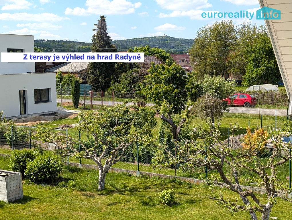 V patře jsou 2 pokoje s možností rozdělení na 3, koupelna s WC a terasa s pěkným výhledem na zahradu a na hrad Radyně.