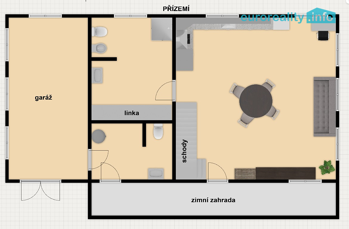 V přízemí je obývací pokoj s kuchyňskou linkou, koupelna s prádelnou, WC, WC pro hosty a také přímý vstup do velké garáže pro dva automobily.