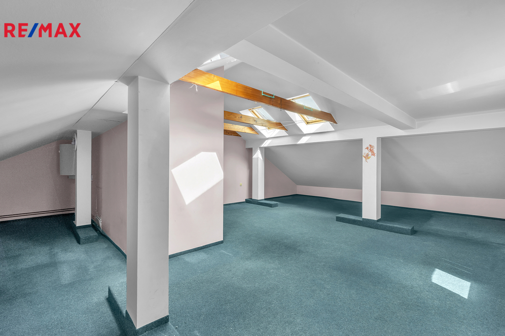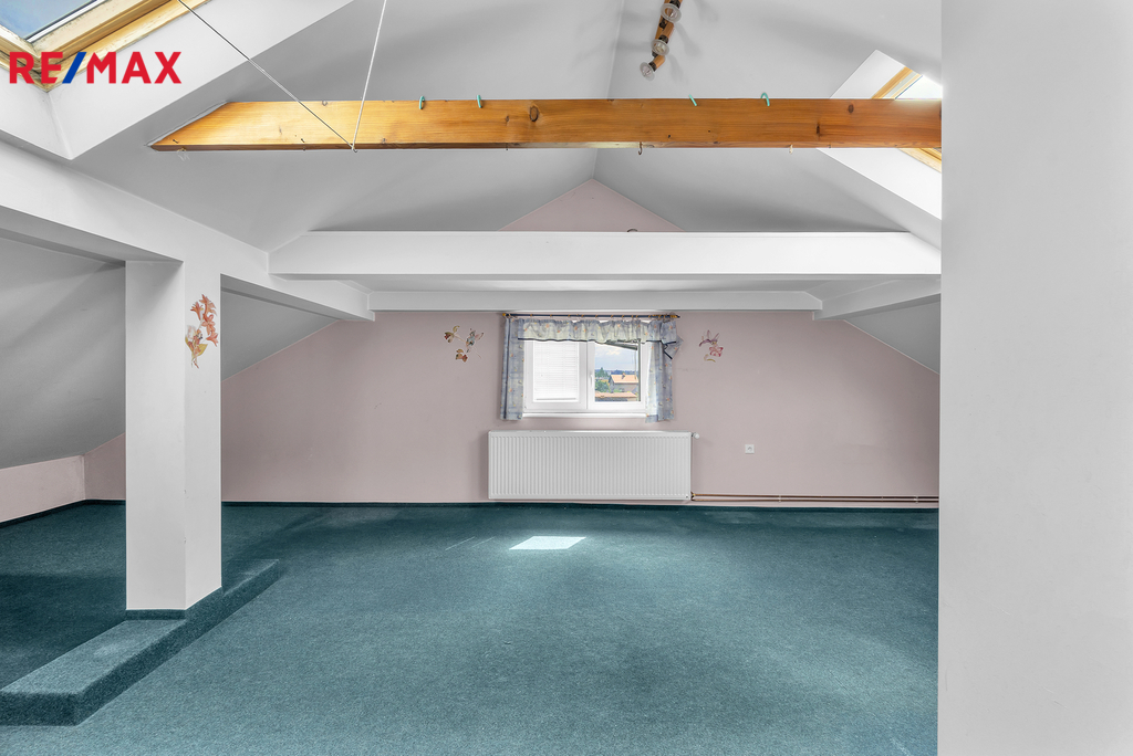 Obytné podkroví: velký obytný pokoj, koupelna se sprchovým koutem + samostatné WC
