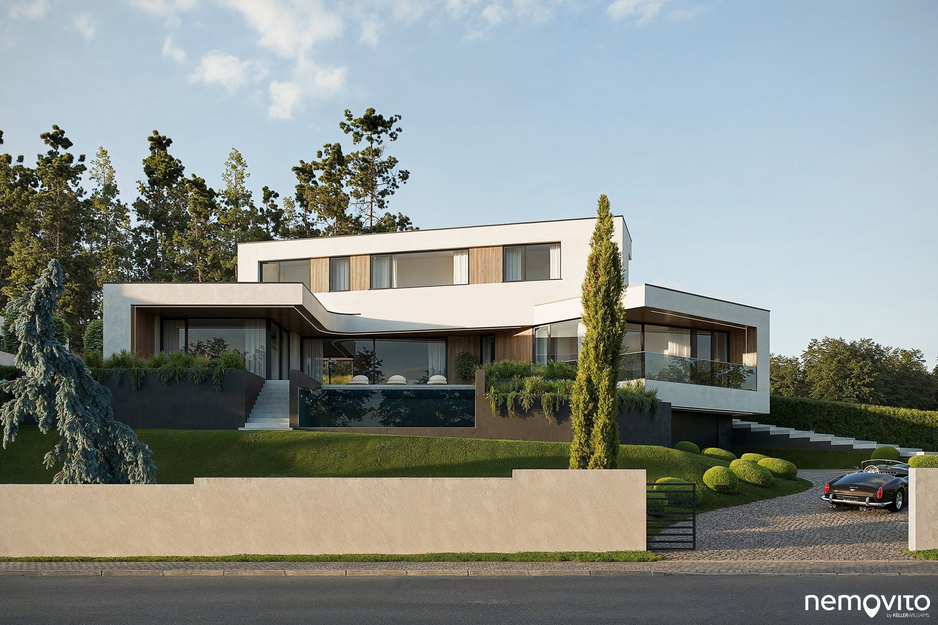 Dům o dispozici 6+kk (462 m2 plochy) nabízí ve 3 podlažích komfort početné rodině, který nespočívá pouze ve velkorysé ploše, ale taktéž smysluplně řešené dispozici se spoustou úložných prostor. Vila, která svým pojetím navazuje na myšlenky funkcionalismu, hojně pracuje s velkou prosklenou plochou, která prostřednictvím precizně orientovaných výhledů těží maximum z konkrétního místa. V úrovni příjezdu se nachází garáž (2 auta + moto), místnost na sportovní náčiní a sklady. Druhému podlaží dominuje více jak 80 m2 obývák s terasou k bazénu a pokoj pro hosty. Poslední podlaží je věnováno ložnicím.