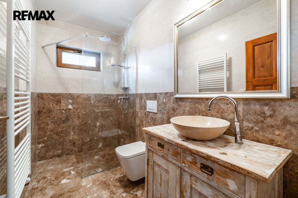 V přízemí domu se nachází prostorný obývací pokoj, kuchyň s jídelnou a dvě ložnice s koupelnou a toaletou, všechny tyto prostory mají přímý vstup na rozlehlou terasu. V patře jsou dvě prostorné ložnice, každá s vlastní koupelnou a toaletou a vlastním vstupem na balkon, respektive terasu. Prostory k uskladnění nabízí půda. Technická místnost, prostorná komora a šatna jsou k dispozici ve vstupní části přízemí, rovněž dvě krytá parkovací stání.
