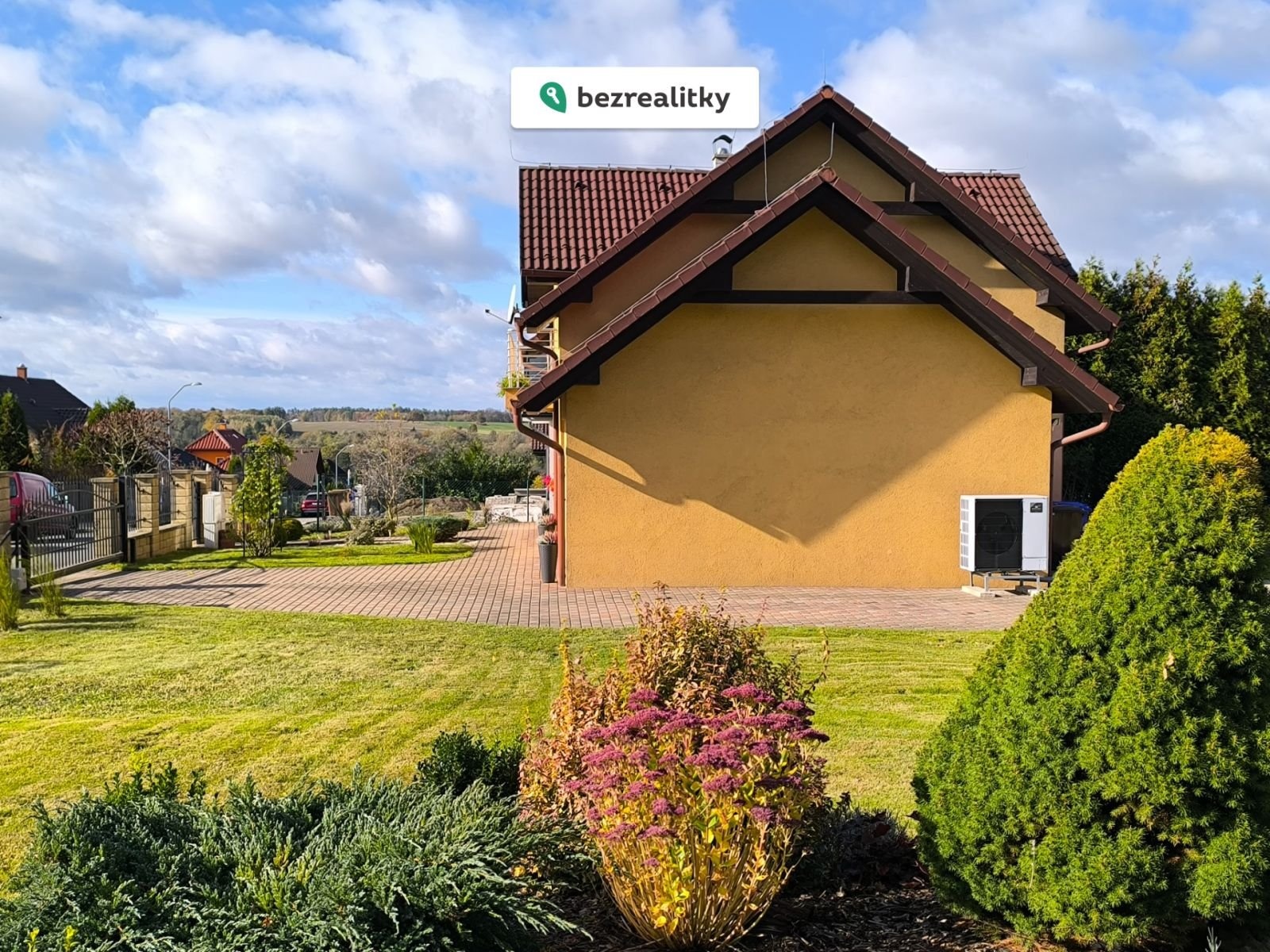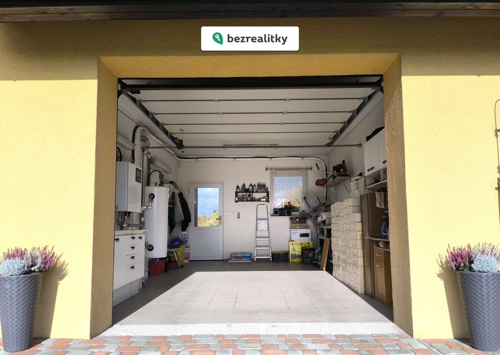 Součástí prodeje je rovinatý, oplocený pozemek o celkové výměře 1737 m², kde se kromě ovocných keřů a stromů nachází zahradní domek, pergola, terasa a jezírko. Součástí stavby je také prostorná garáž se sekčními vraty na dálkové ovládání, stejně jako příjezdová brána. Zabezpečení GSM alarmem zajišťuje ochranu domu s možností napojení na pult centrální ochrany.