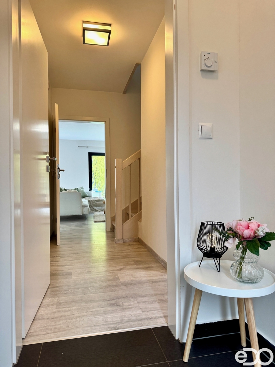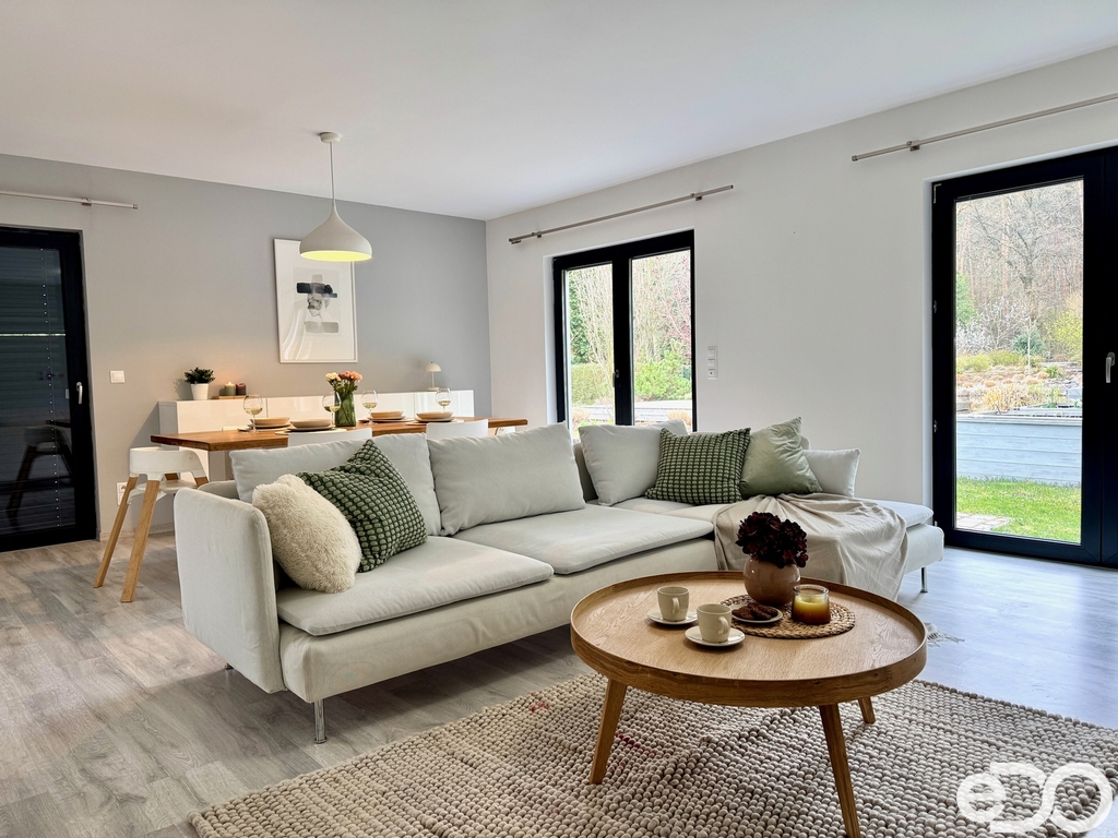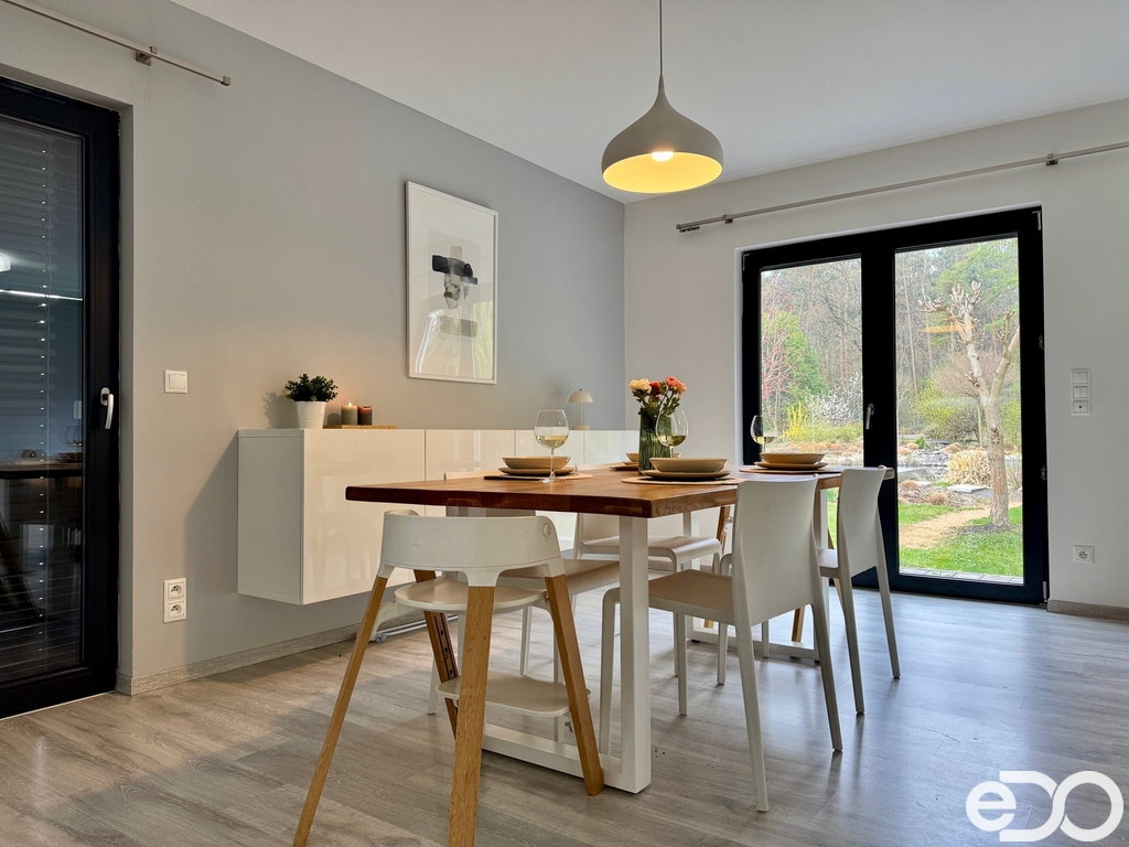 Dominantou nemovitosti je prostorný obývací pokoj s kuchyňským koutem a přímým vstupem na velkou terasu, která navazuje na udržovanou zahradu. Ta poskytuje dostatek soukromí, nachází se zde okrasné jezírko i zázemí pro děti. Údržba zahrady je nenáročná – stačí pravidelné sekání trávy, o začátek a konec sezóny i průběžnou péči se stará majitel.