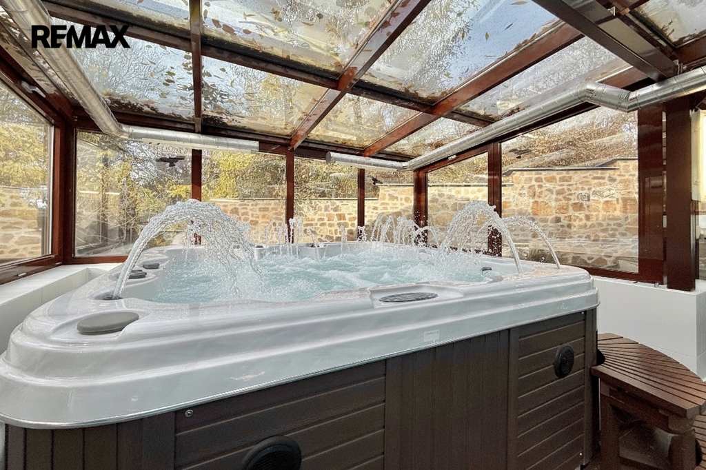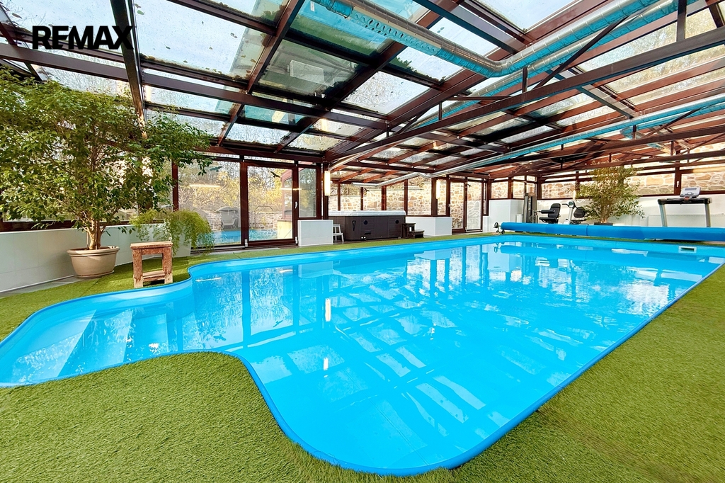 S celkovou rozlohou pozemku 2.968 m² nabízí tento impozantní objekt veškeré prvky pro pohodlný a pohodový život, včetně dvou garáží, vnitřního bazénu, vířivky, fitness centra, sauny a moderního skleníku, které jsou součástí této unikátní nemovitosti.