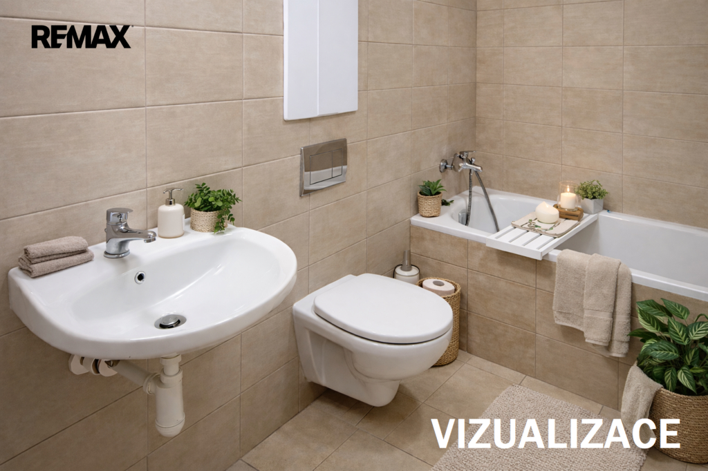 Dispozici tvoří obytný pokoj s moderním kuchyňským koutem, vstupní chodba a prostorná koupelna s vanou, toaletou, pračkou a sušičkou. Byt zůstává částečně vybavený, takže je připravený k okamžitému nastěhování bez nutnosti dalších investic.