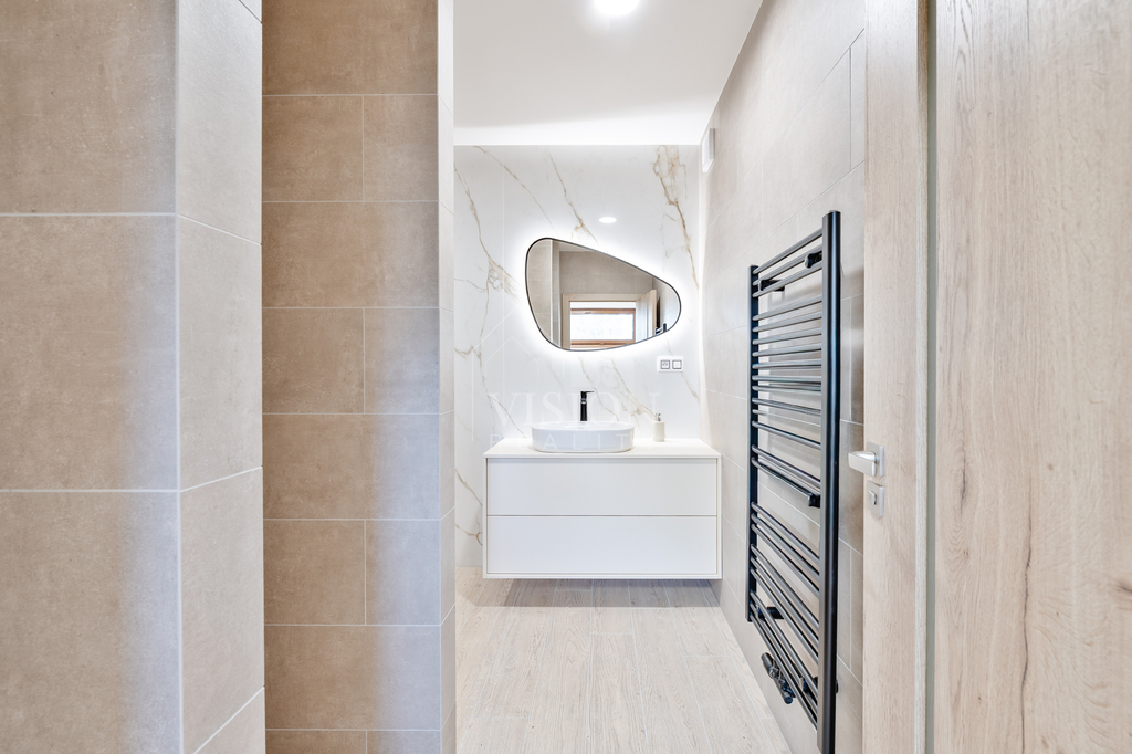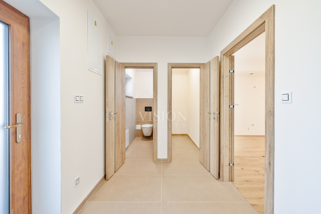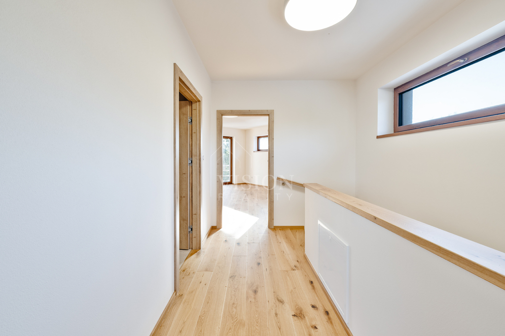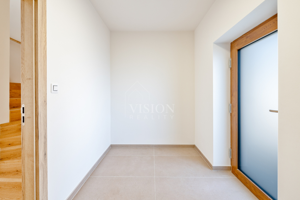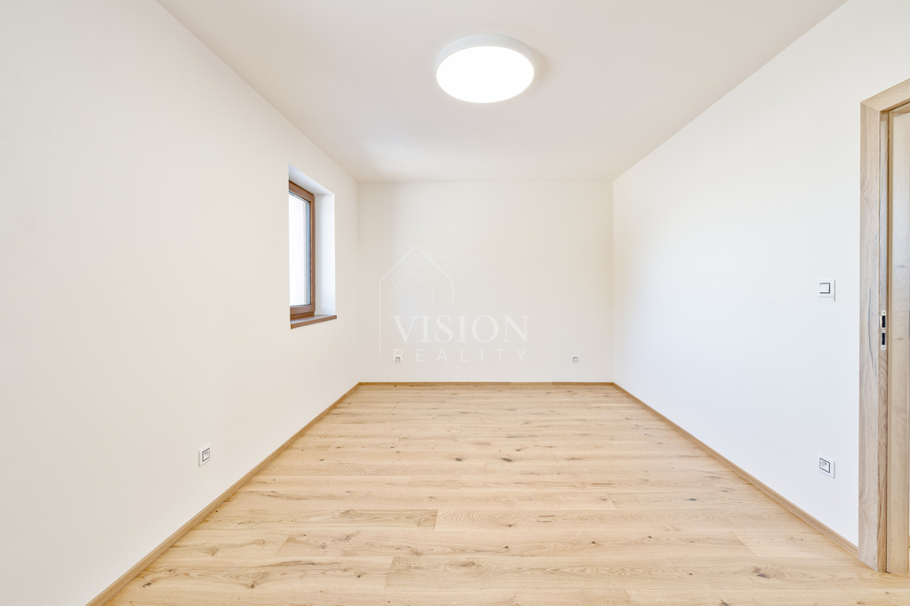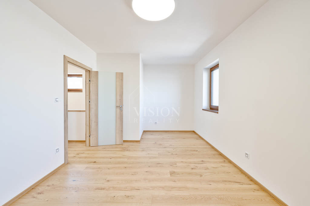 Ve spodním patře prostorný obývací pokoj s kuchyní a vstupem na zahradu, vstupní hala, wc a spíž, horním patře dva klidné pokoje a moderní koupelna s velkoformátovou dlažbou.
