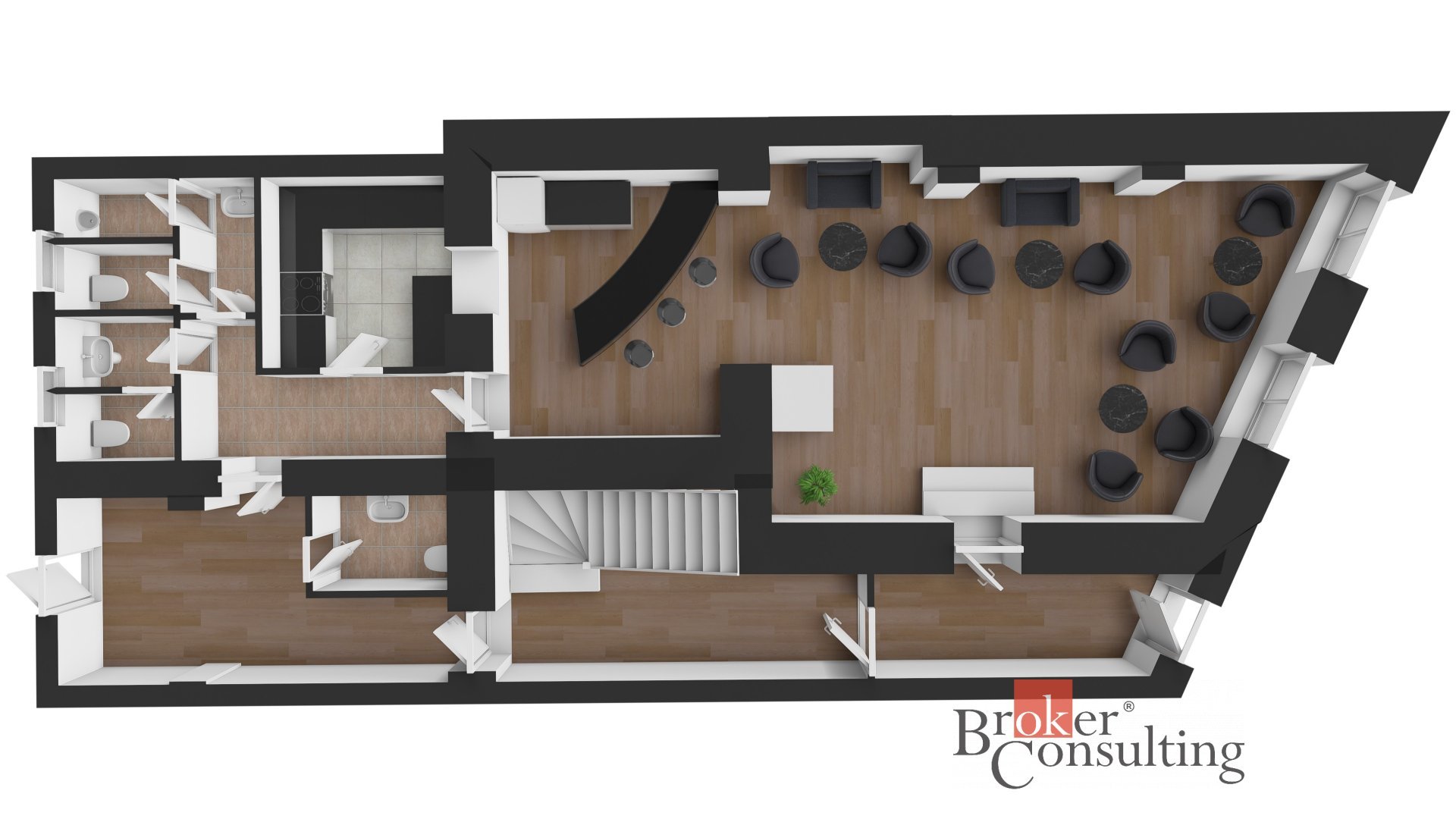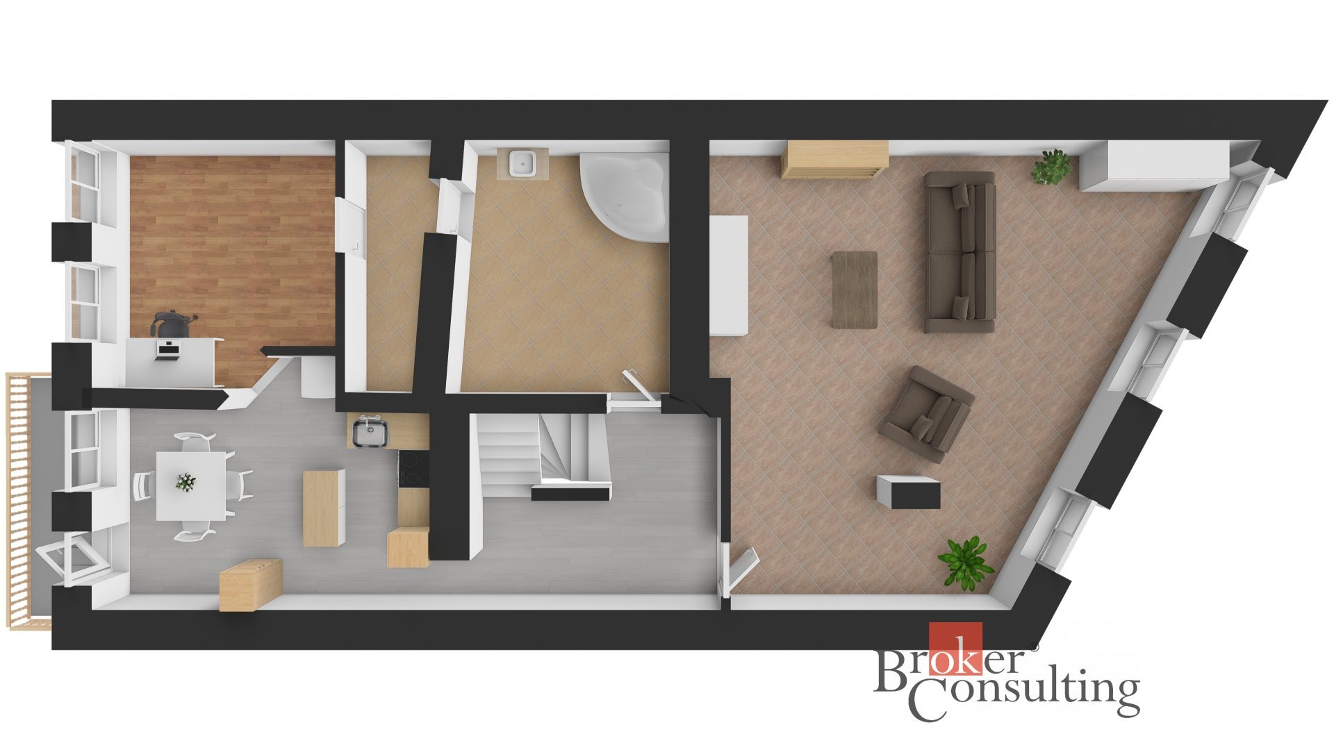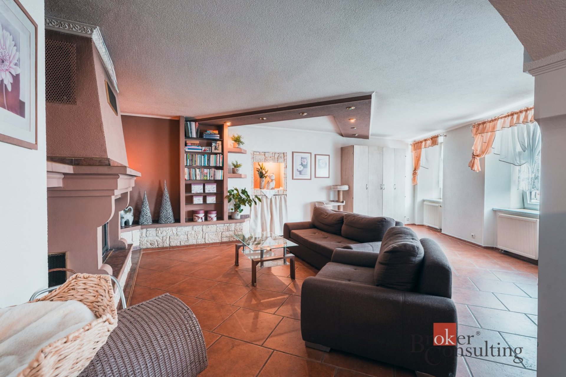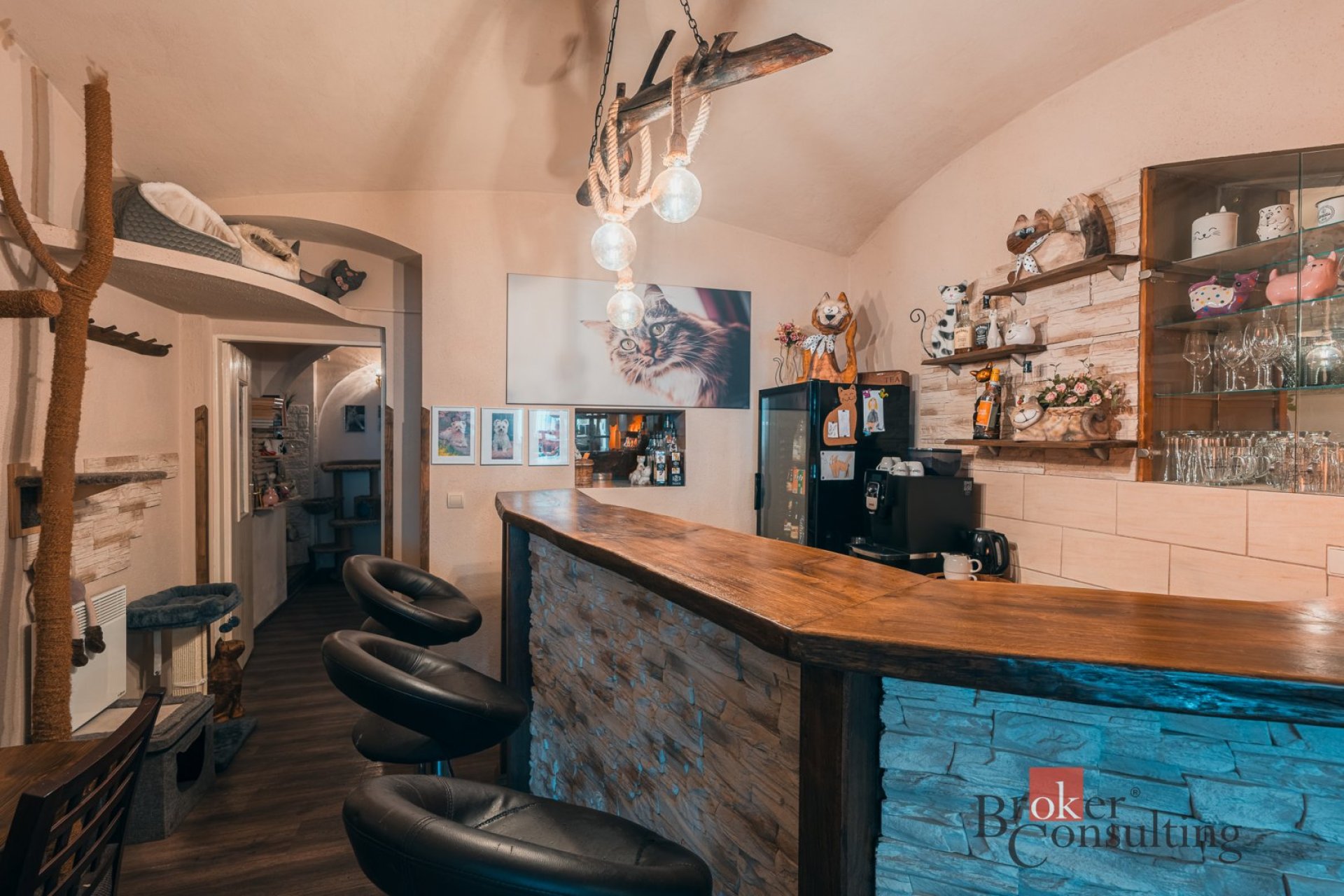 V přízemí budovy je nebytový prostor (aktuálně provozovaný jako kočičí kavárna) se samostatným využitím – ideální pro kavárnu, kancelář, služby, menší obchod nebo jako jednotka pro pronájem. To vše o celkové užitné ploše 67 m2. Dále je zde chodba a schodiště do bytové jednotky nacházející se v 1. patře, která disponuje celkovou plochou 101 m2. V současné chvíli s dispozicí 2+1. Nad bytem je podkroví vhodné k případné obytné vestavbě. Jak v kavárně, tak i v obývacím pokoji bytu je instalován krb, který zajišťuje dostatek tepla. V kavárně je součástí krbu i výměník. Dům je jinak vytápěn elektrokotlem.