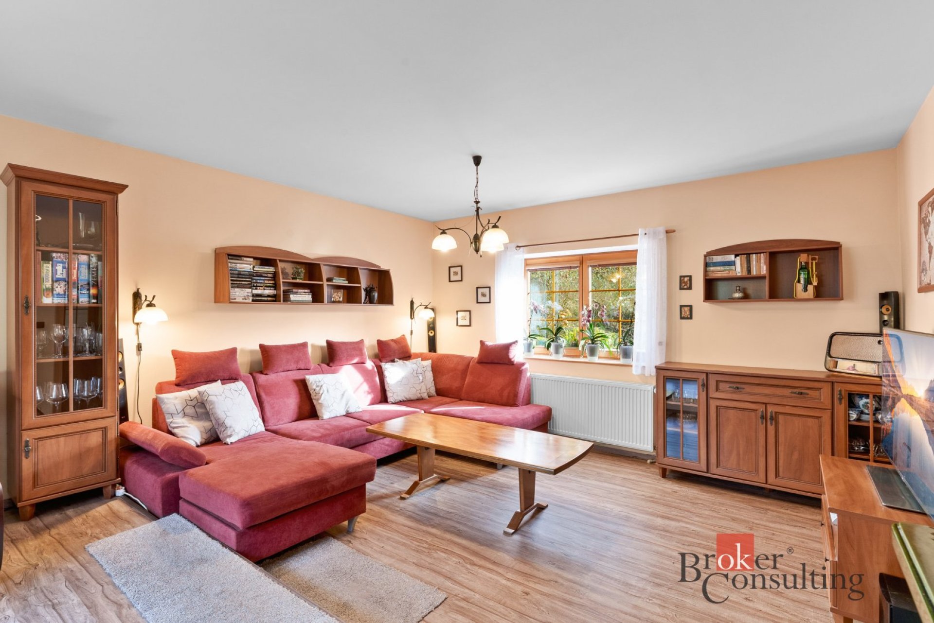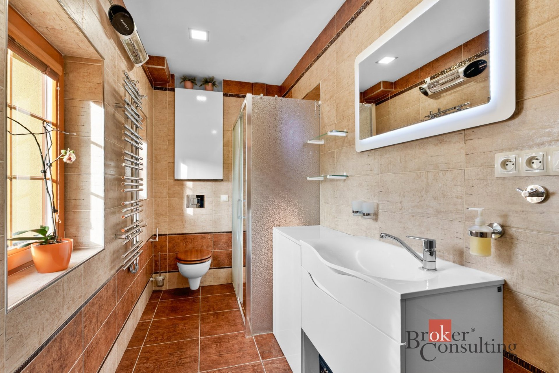 V přízemí se nachází obytný prostor s krbem, kuchyně a prostorná koupelna s vyhřívanou podlahou. V patře jsou tři ložnice a samostatné WC. Součástí domu je vyhřívaná garáž, terasa orientovaná do zahrady a zastřešené parkovací stání.