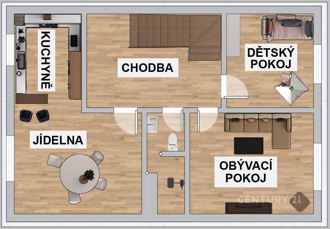 Přízemí a patra: Kuchyně s prostornou jídelnou pro společné rodinné večeře, útulný obývací pokoj a ložnice.