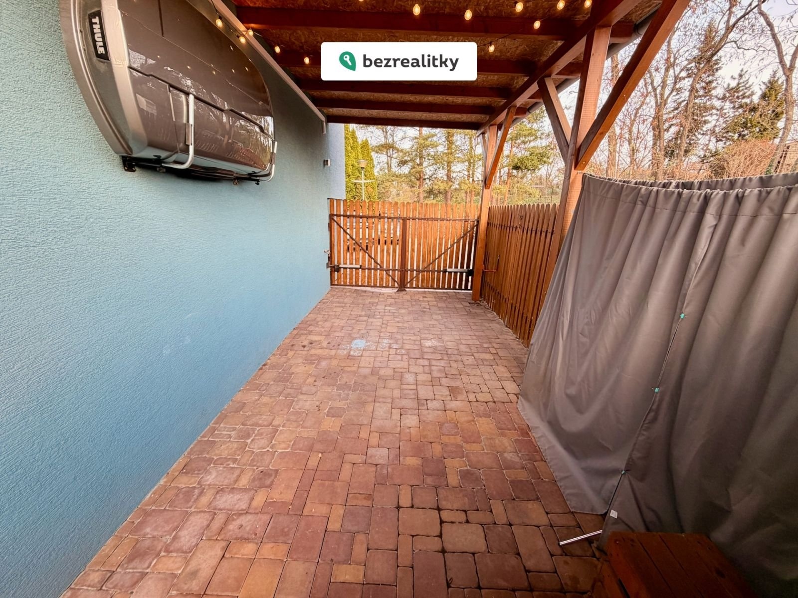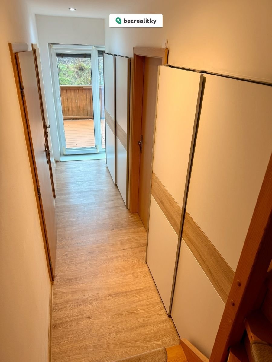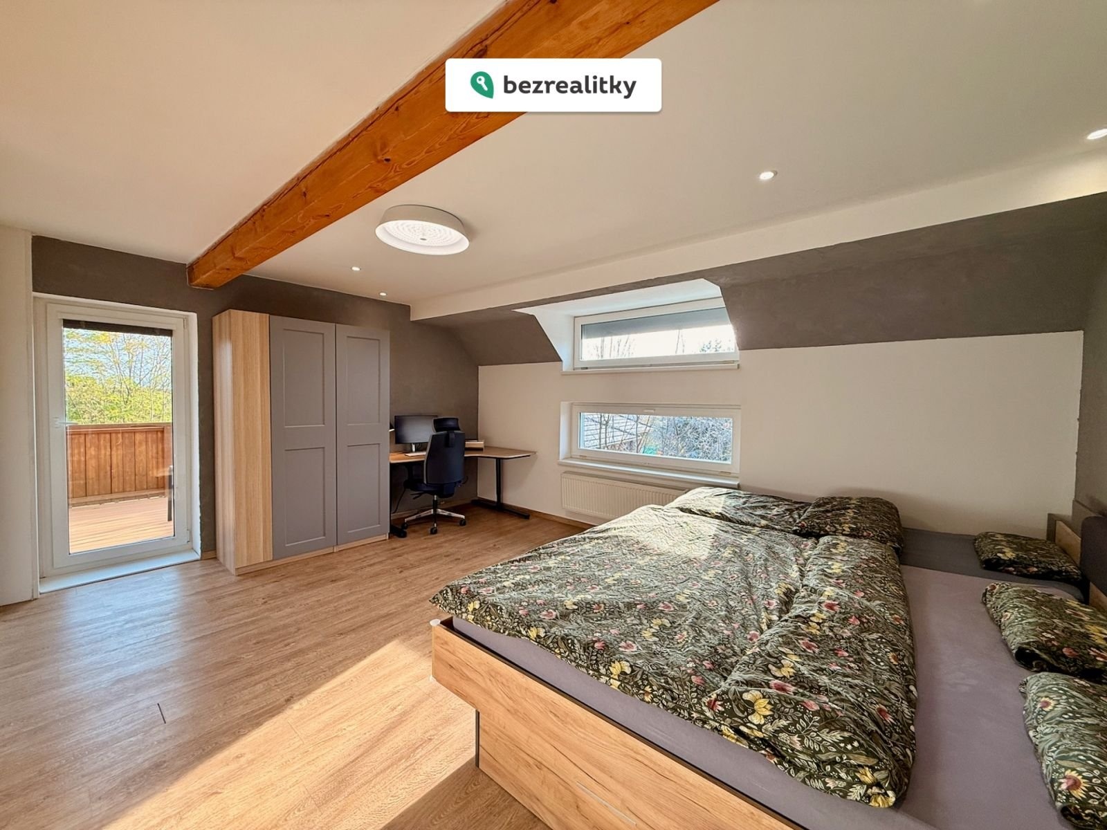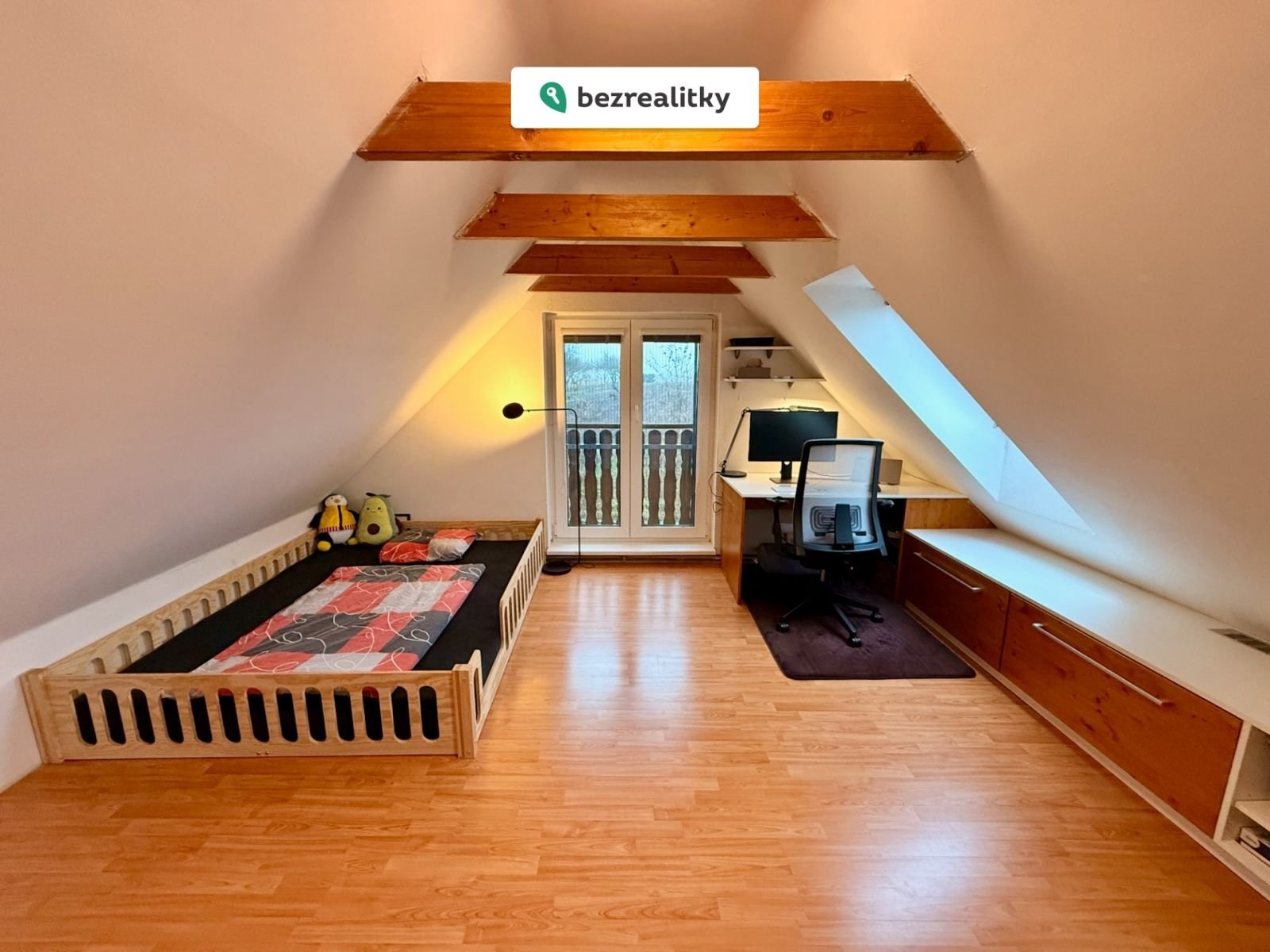 • První patro: Prostorná ložnice (29 m²) a koupelna s vanou a toaletou. Z chodby i z ložnice se dostanete na druhou velkou terasu (20 m²), která zároveň slouží jako přístřešek pro auto.