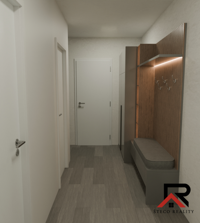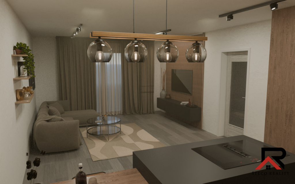 Interiér bytu je vybaven vinylovými podlahami, na výběr jsou čtyři dekory, které umožňují přizpůsobení prostoru podle individuálních preferencí. Obývací pokoj je moderně řešen a slouží jako srdce bytu, přičemž je zde umístěn videotelefon, který funguje jako základ chytré domácnosti – skvělý prvek pro zvýšení bezpečnosti a pohodlí.