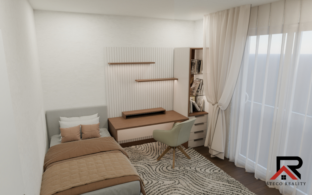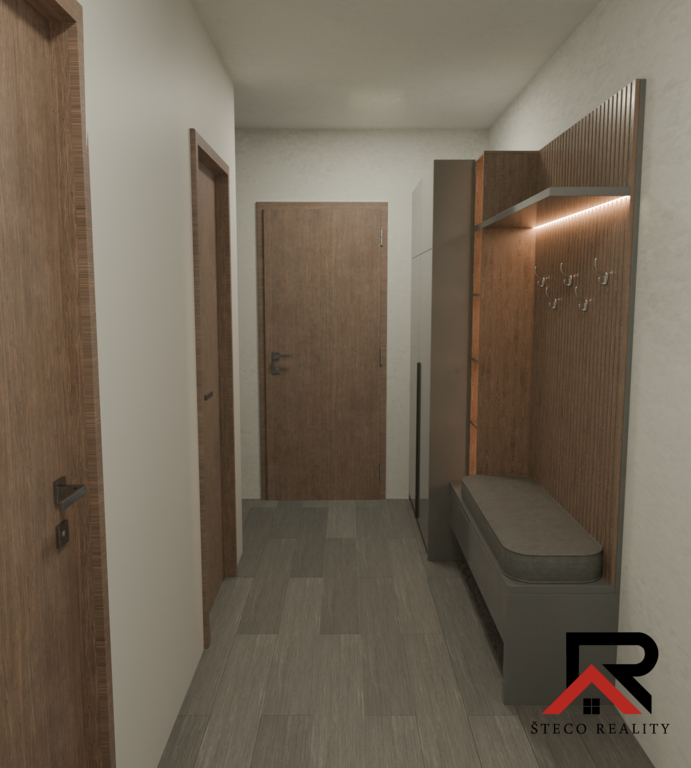 Interiér bytu je vybaven vinylovými podlahami, na výběr jsou čtyři dekory, což umožňuje přizpůsobení prostoru dle individuálních preferencí. Obývací pokoj je moderně řešen a slouží jako srdce bytu, přičemž je zde také umístěn videotelefon, který funguje jako základ chytré domácnosti – ideální prvek pro zvýšení bezpečnosti a pohodlí.