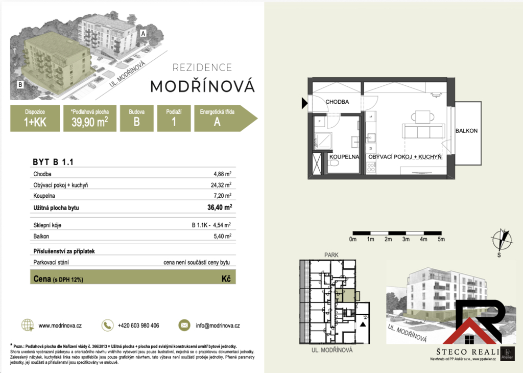 Nabízíme k pronájmu byt v developerském projektu Rezidence Modřinová, nacházející se na ulici Modřínová v Třebíči. Jedná se o nový moderní byt o dispozici 1 + kk, s plochou 39,9 m², umístěný v 1. nadzemním podlaží cihlového objektu. Projekt splňuje přísné normy moderní výstavby a pyšní se energetickým štítkem třídy A. Součástí bytu je nová kuchyňská linka značky Oresi. Zálohy za energie činí 2000,- Kč.