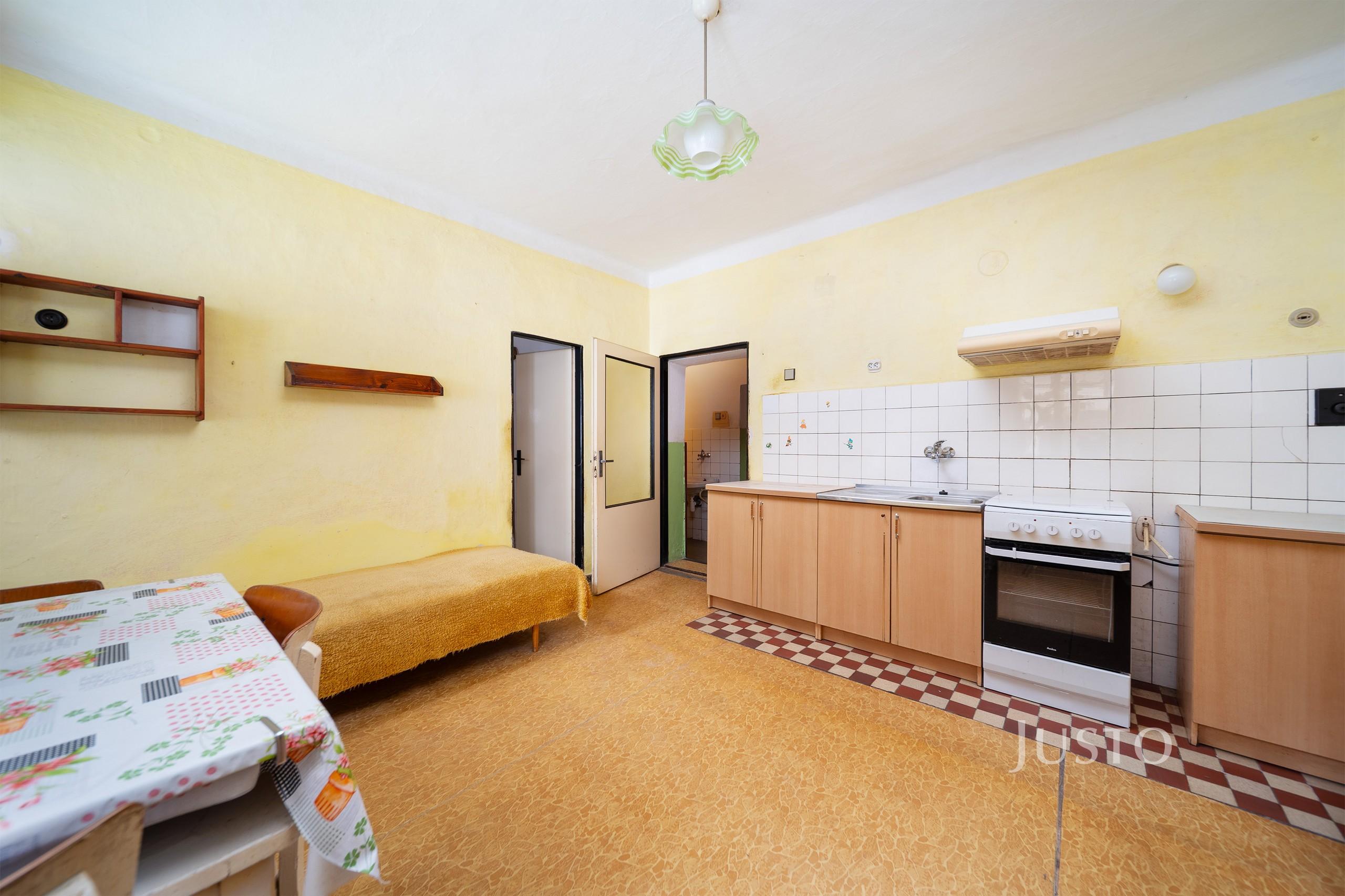 V přízemí se nachází obývací pokoj, kuchyně, koupelna a samostatné WC. Součástí domu je také průjezd, který může sloužit jako kryté parkování, dílna nebo praktické zázemí. Zároveň tudy projdete na uzavřený dvorek, který nabízí soukromí a prostor pro venkovní posezení.