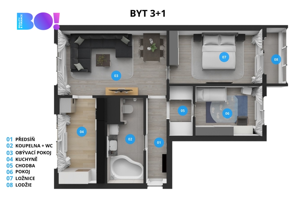 - Dispozice bytu: 3+1