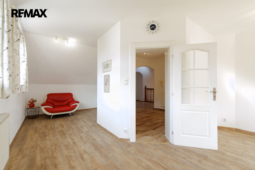 K dispozici je pět samostatných ložnic, dvě koupelny a samostatné WC. Každá ložnice má navíc vstup na balkon orientovaný do klidného okolí, což zajišťuje dostatek světla i příjemné propojení s okolní zelení. Parkování zajišťuje prostorná garáž pro dva vozy vybavená dobíjecí stanicí pro elektromobil i další stání přímo na pozemku. Standardem jsou dřevěná eurookna, podlahy kombinující vinyl a dlažbu, vytápění je řešeno plynovým kotlem.