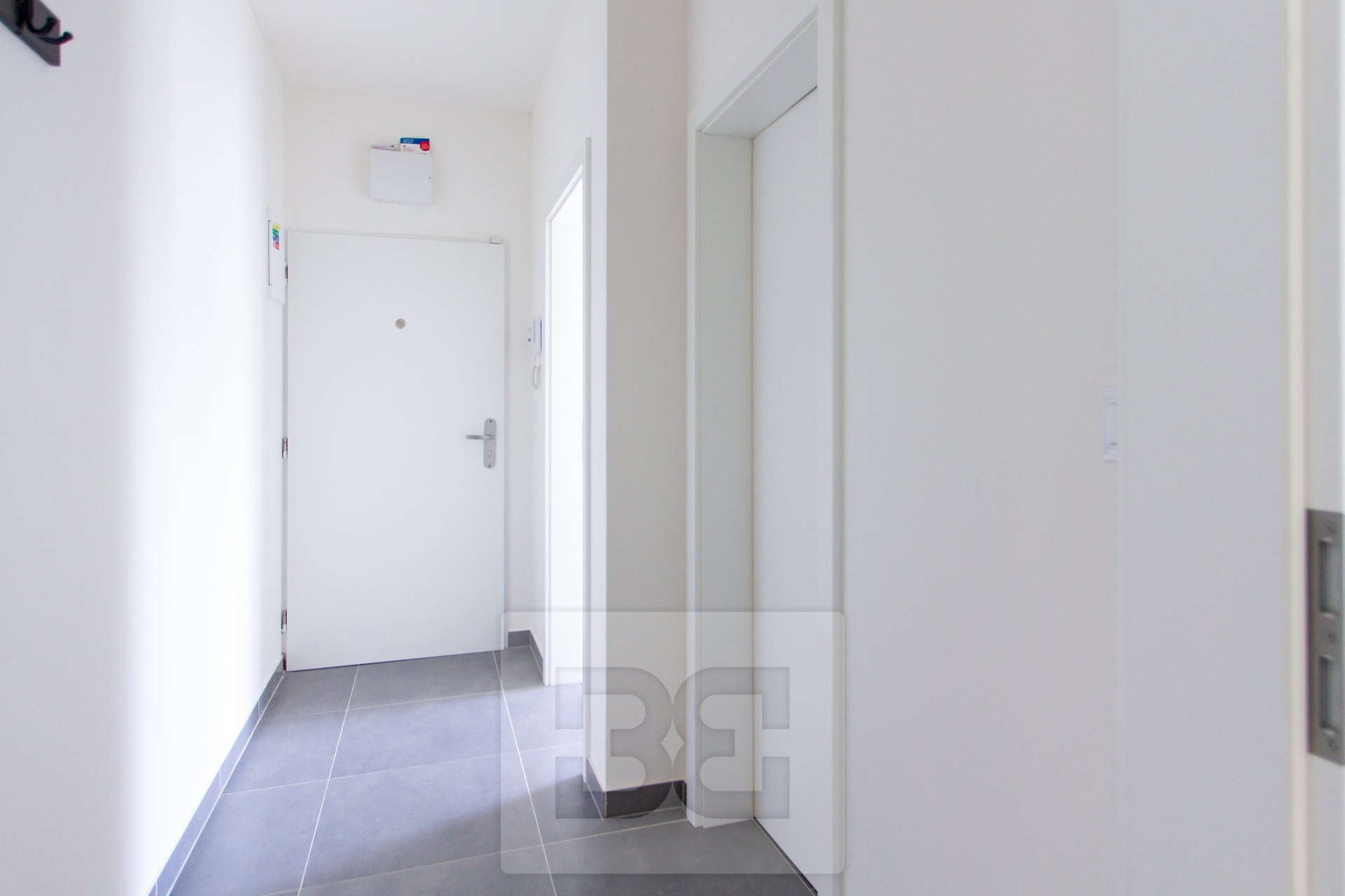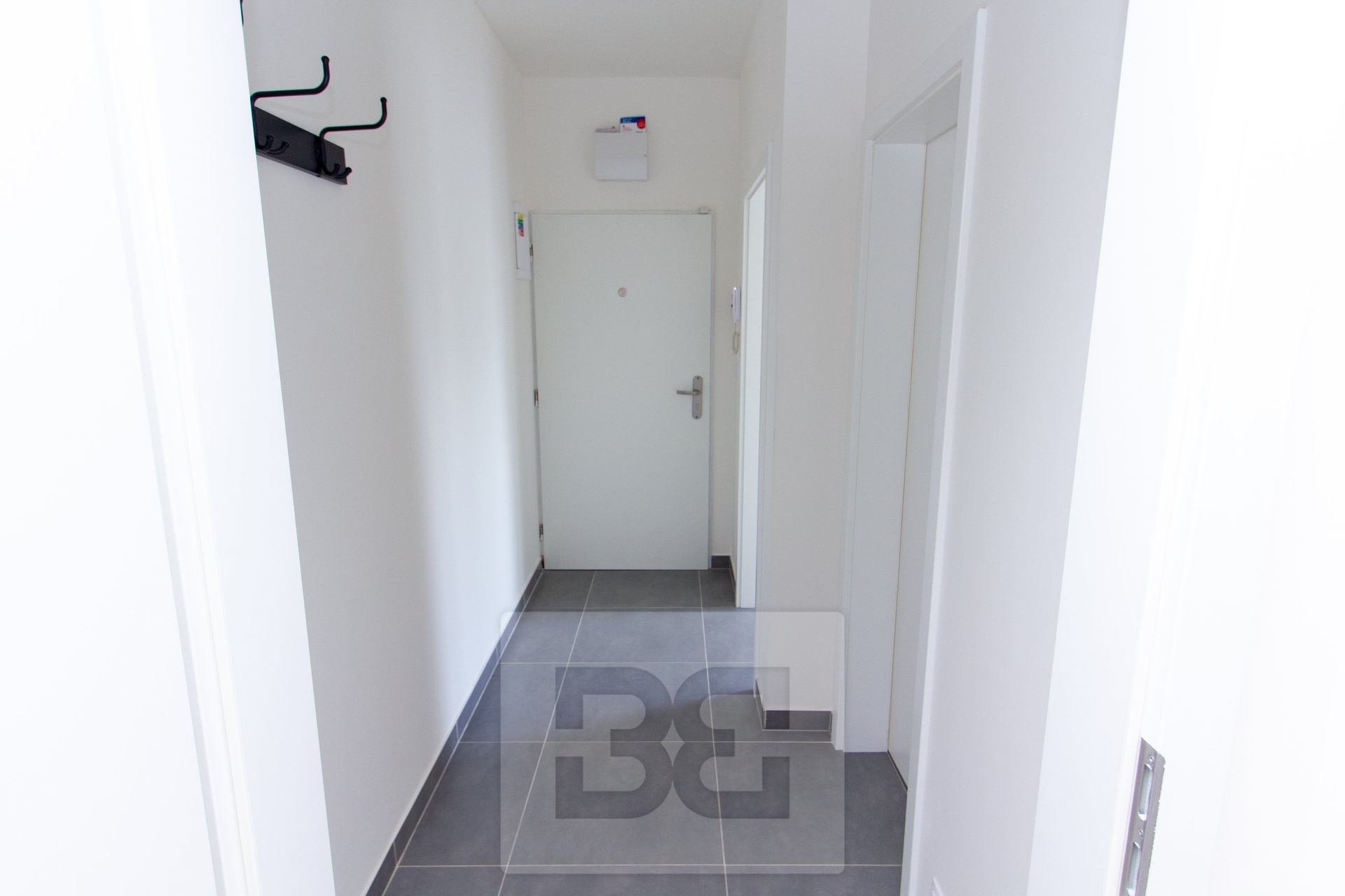 Vstup do bytu vede do předsíně (4,2 m²), ze které je přístup do obývacího pokoje s kuchyňským koutem (16 m²), ložnice (6,2 m²) a koupelny (4,1 m²). Obývací pokoj je vybaven moderní kuchyňskou linkou se spotřebiči (lednice s mrazákem, elektrická varná deska, digestoř). Obývací pokoj i ložnice mají vlastní balkon o ploše 3,5 m².