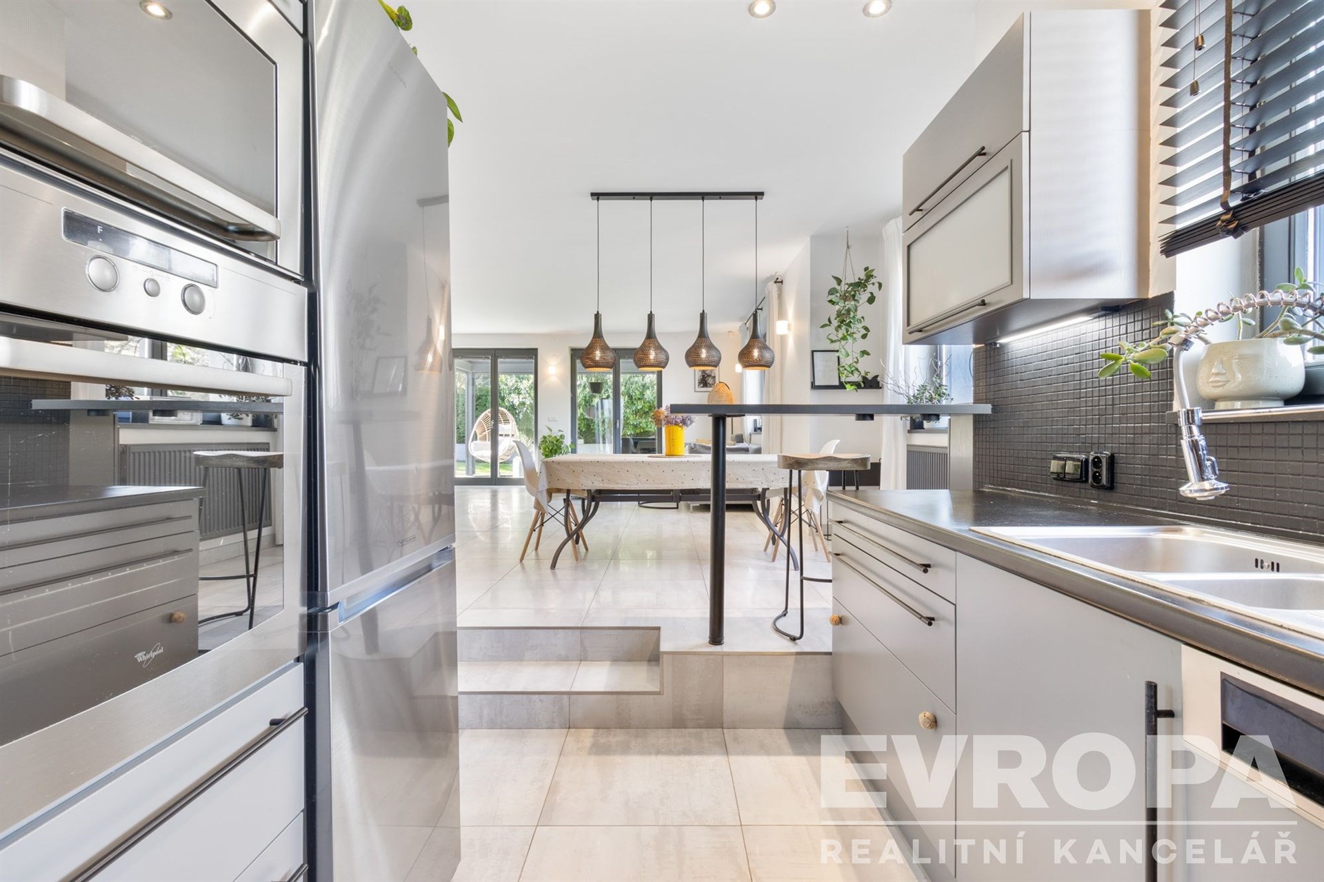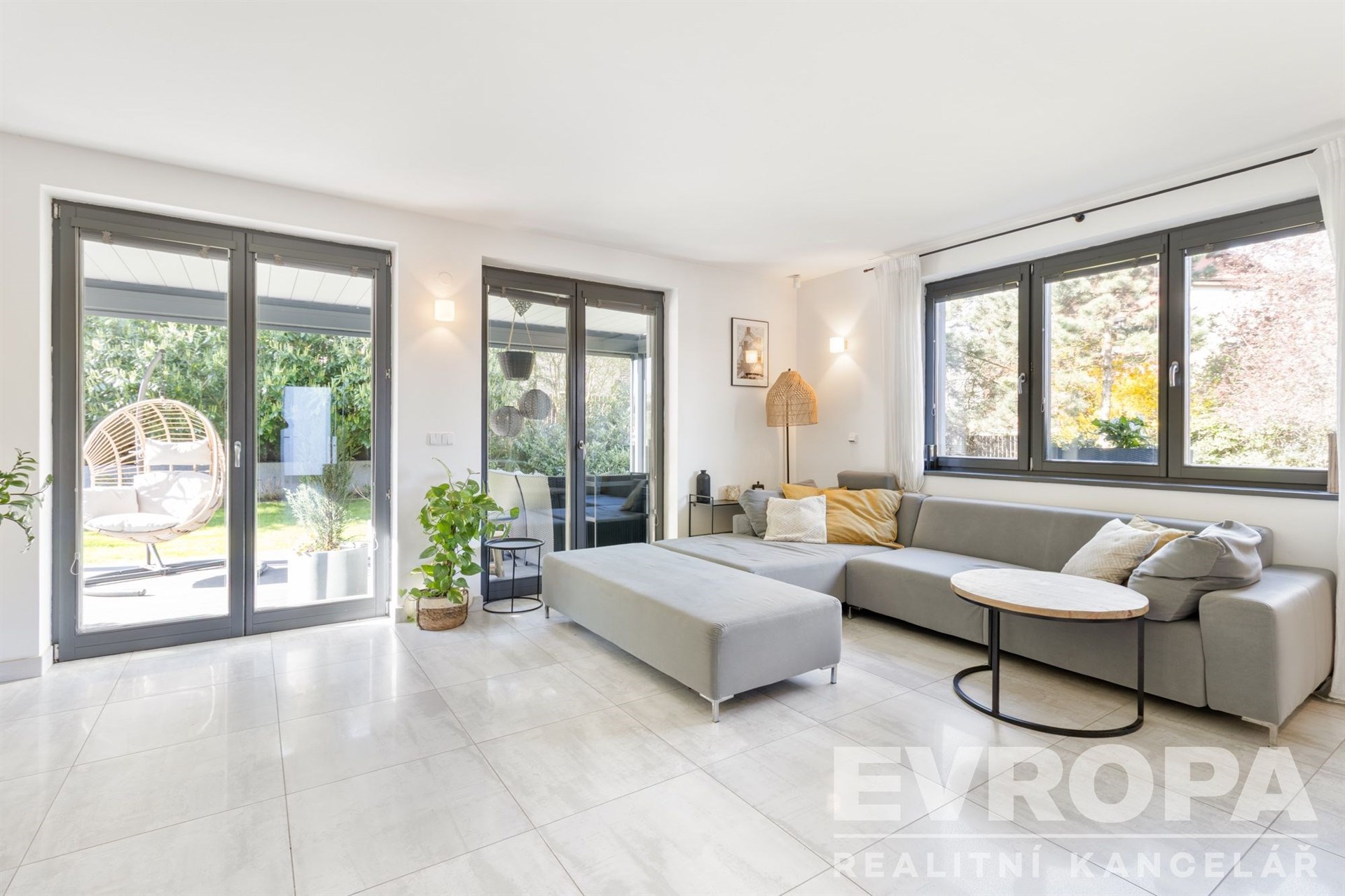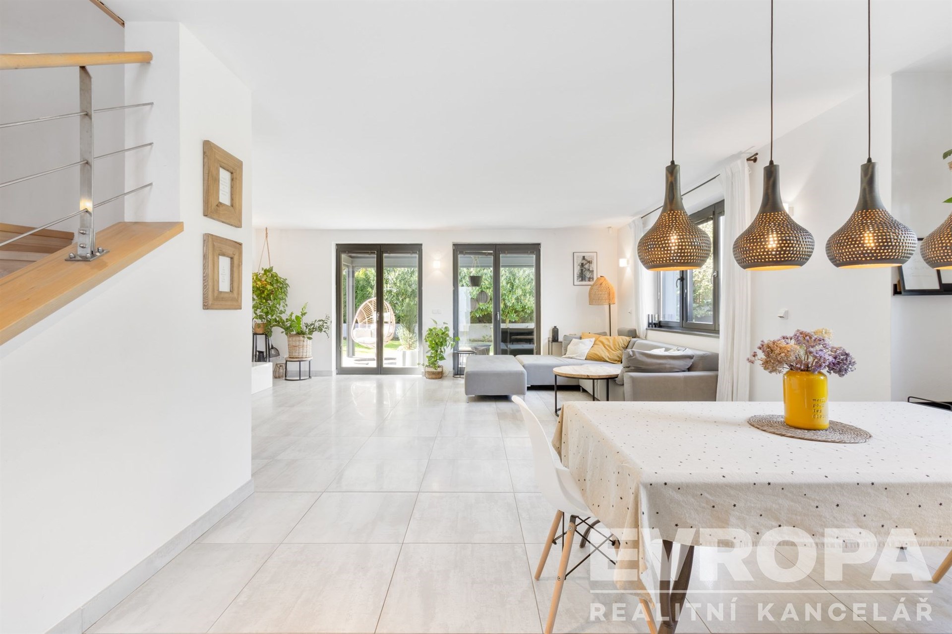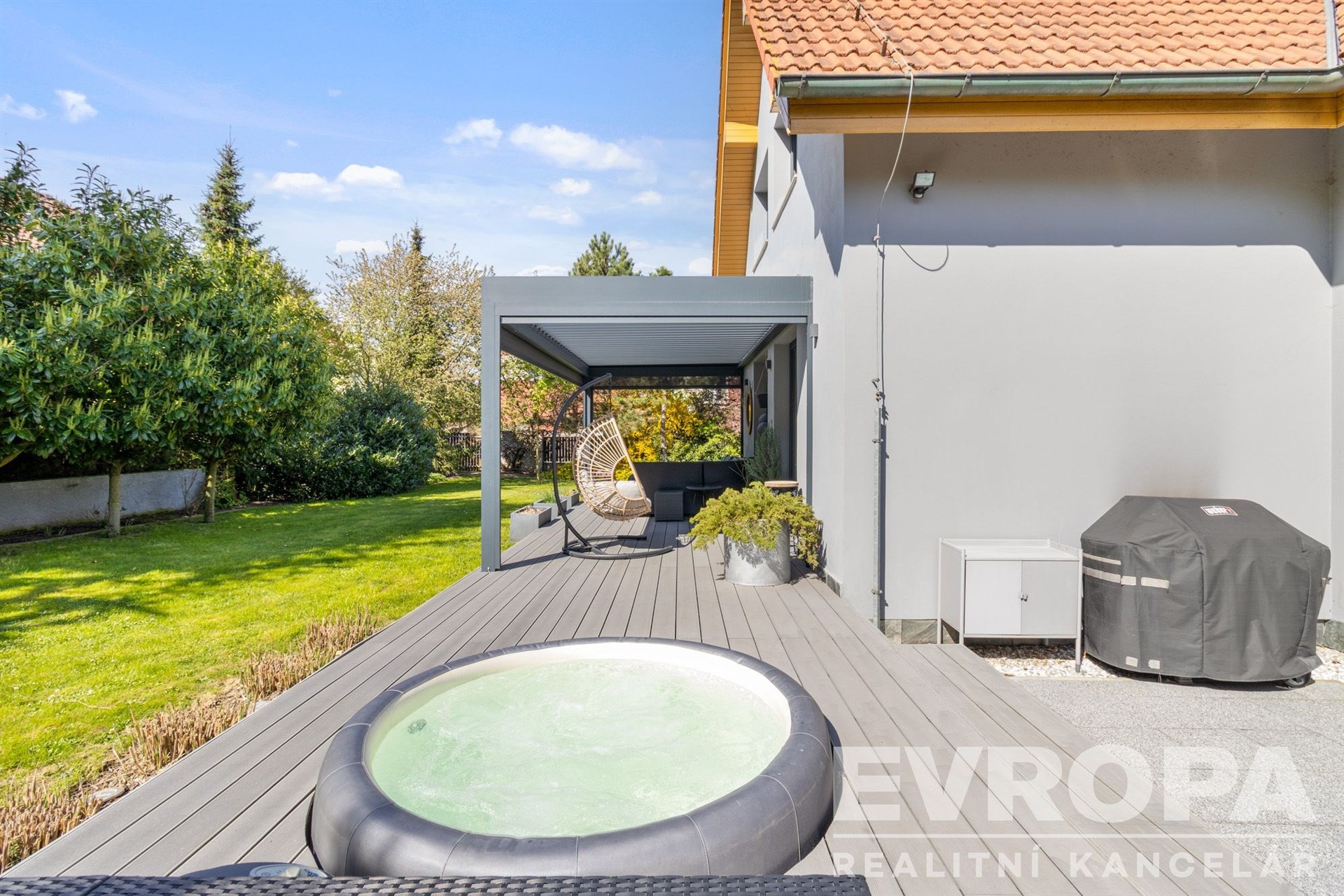 V přízemí se nachází vzdušný obytný prostor propojený s kuchyní a jídelnou, s přímým vstupem na zahradu s terasou. Ta je vybavena bioklimatickou pergolou, vířivkou, grilovacím koutem a venkovním betonovým stolem. Dále je zde samostatný pokoj, koupelna s WC a prostorné zádveří. Vstup do domu vede přes jižní terasu s krásným výhledem do okolí.