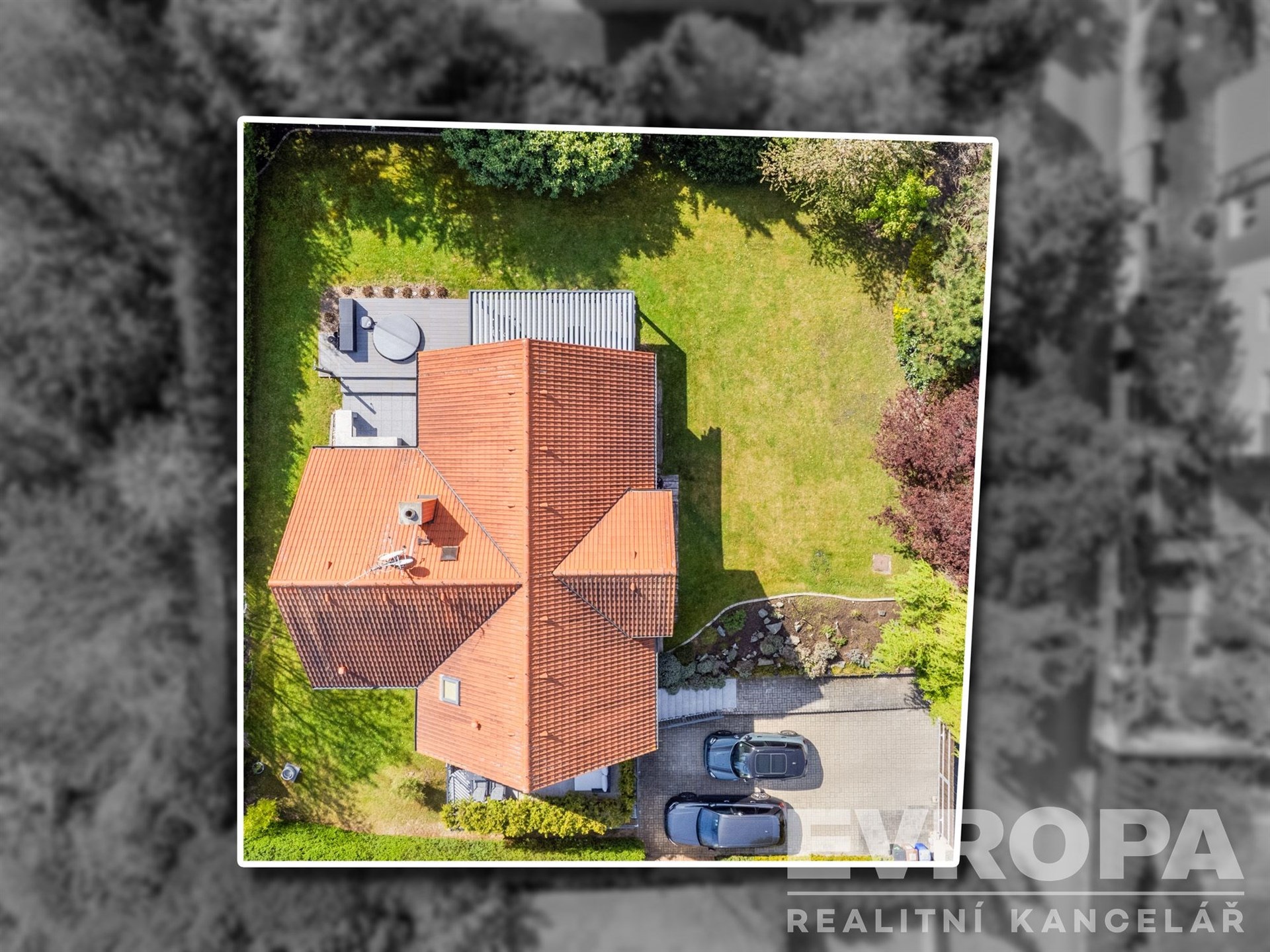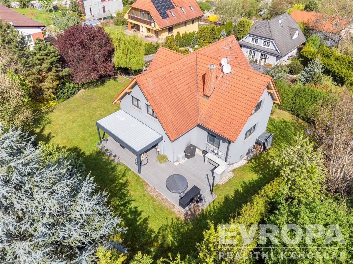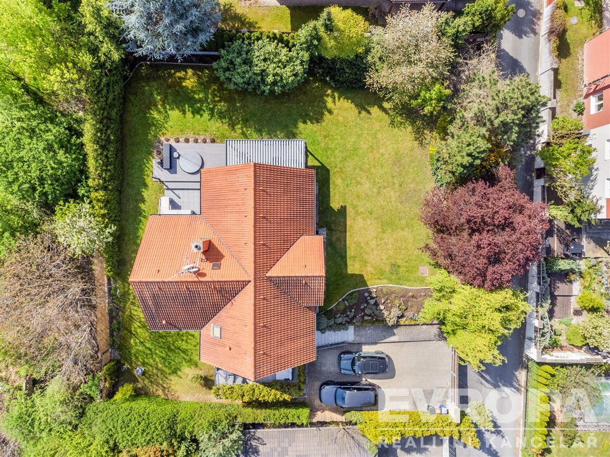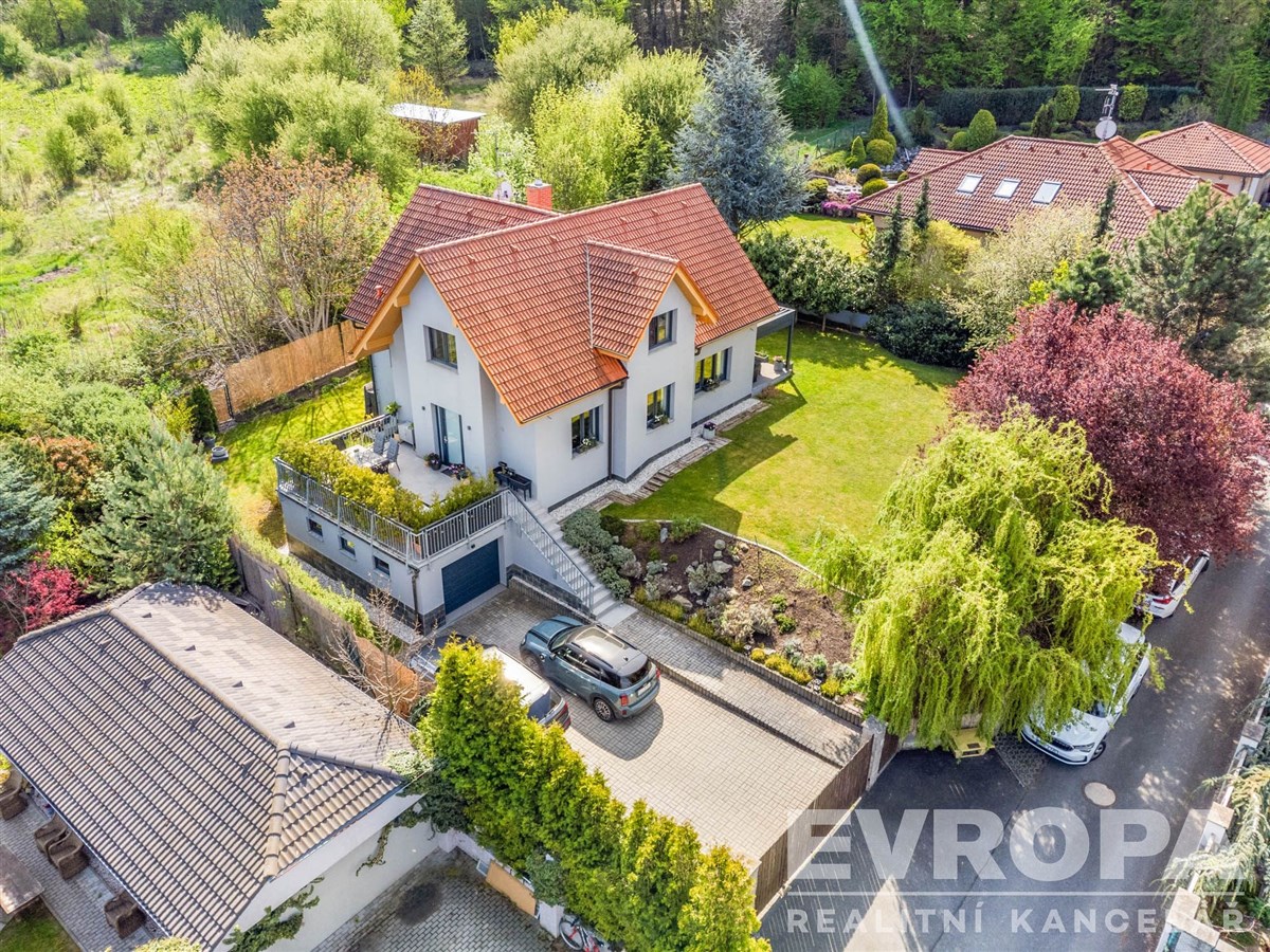 Pozemek se vzrostlými stromy, keři a okrasnou zahradou zaručuje naprosté soukromí a ničím nerušený výhled do údolí. Parkování je zajištěno v garáži a na čtyřech venkovních stáních na vlastním pozemku u domu.