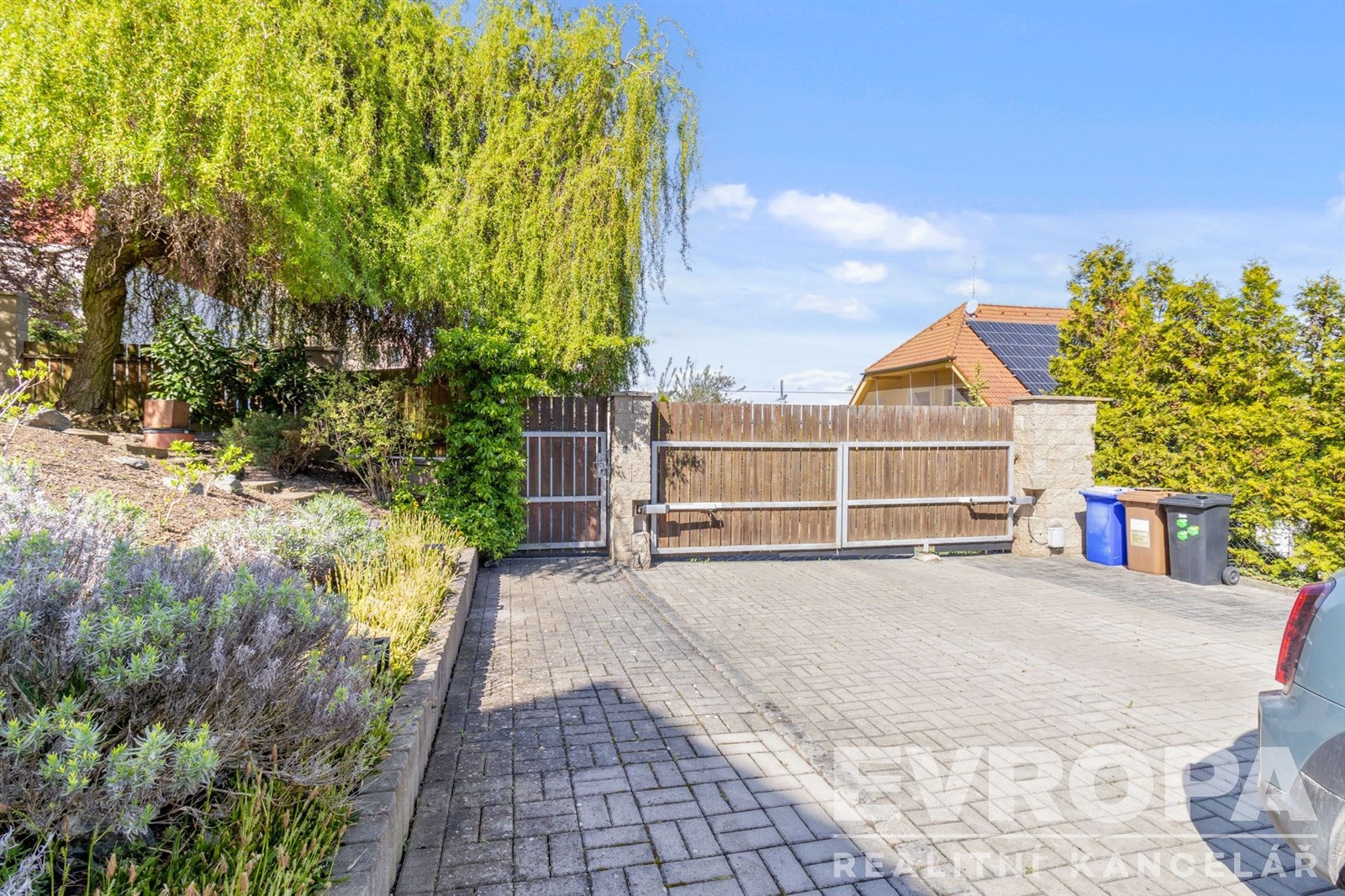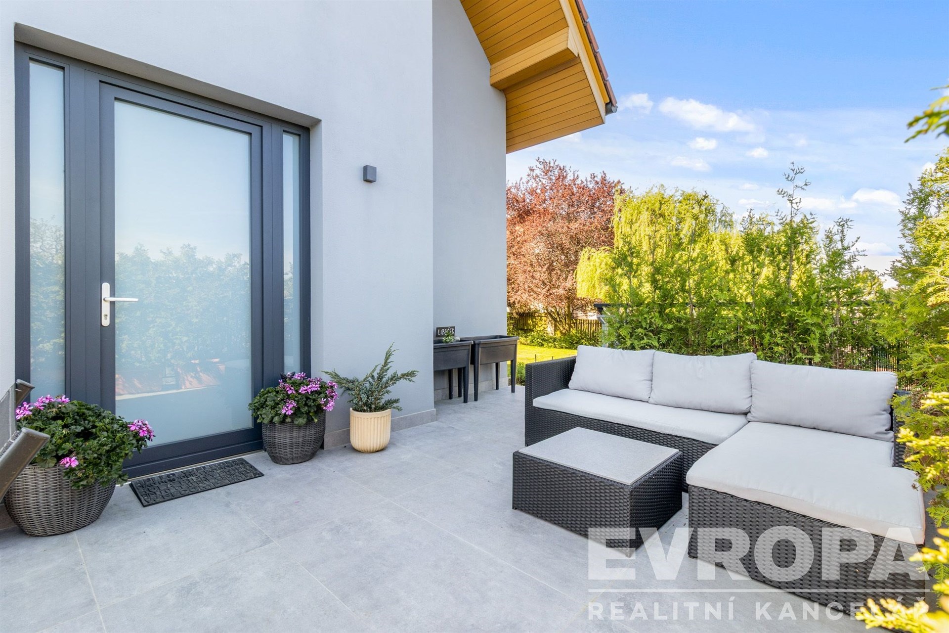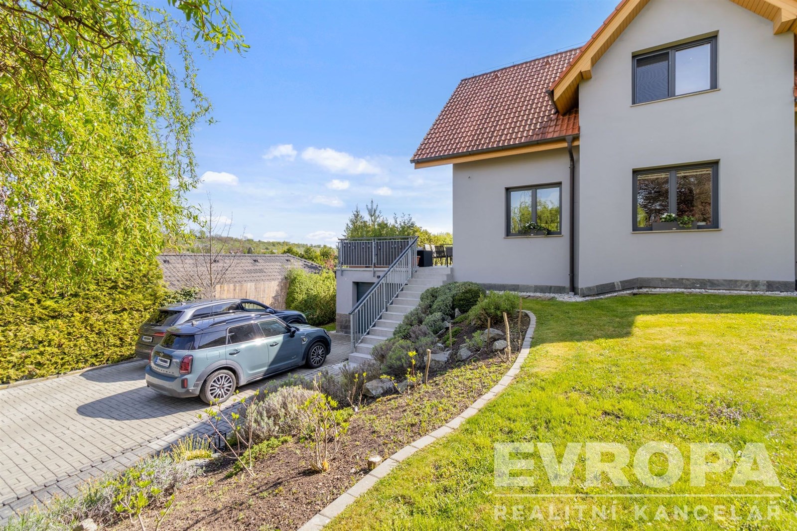 Pozemek se vzrostlými stromy, keři a okrasnou zahradou zaručuje naprosté soukromí a ničím nerušený výhled do údolí. Parkování je zajištěno v garáži a na čtyřech venkovních stáních na vlastním pozemku u domu.