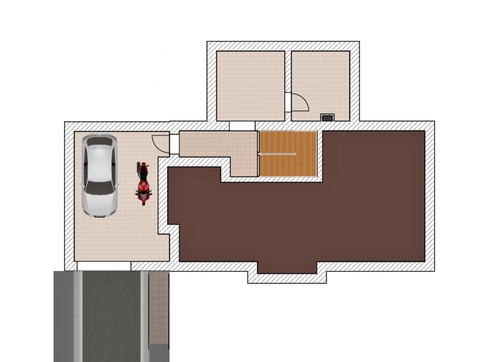 V suterénu domu je garáž pro jeden vůz a další místnost poskytující dostatek úložného prostoru.