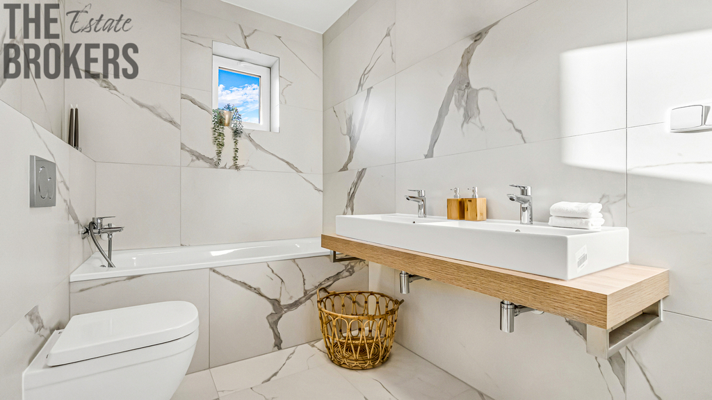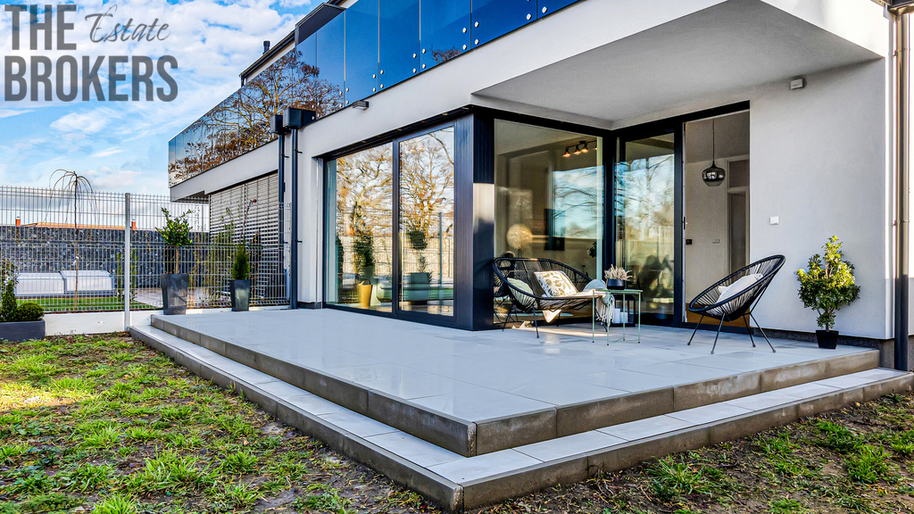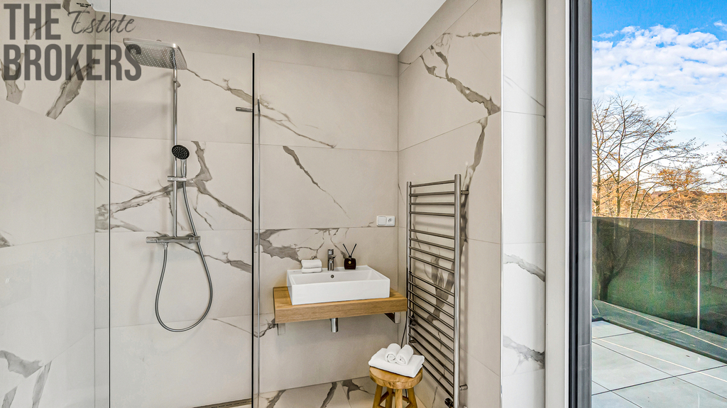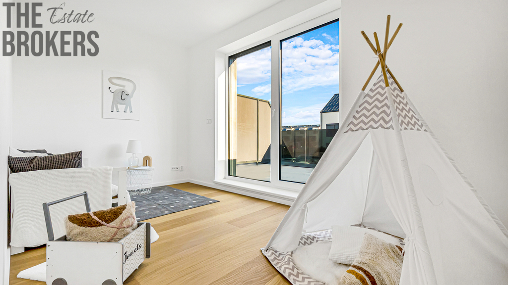 V prvním patře se nachází hlavní ložnice s vlastní koupelnou, šatnou a soukromou terasou. Dále jsou zde dva dětské pokoje, každý s vlastní terasou, a další koupelna. Dispozice je ideální pro rodinné bydlení s dostatkem soukromí pro každého člena domácnosti.