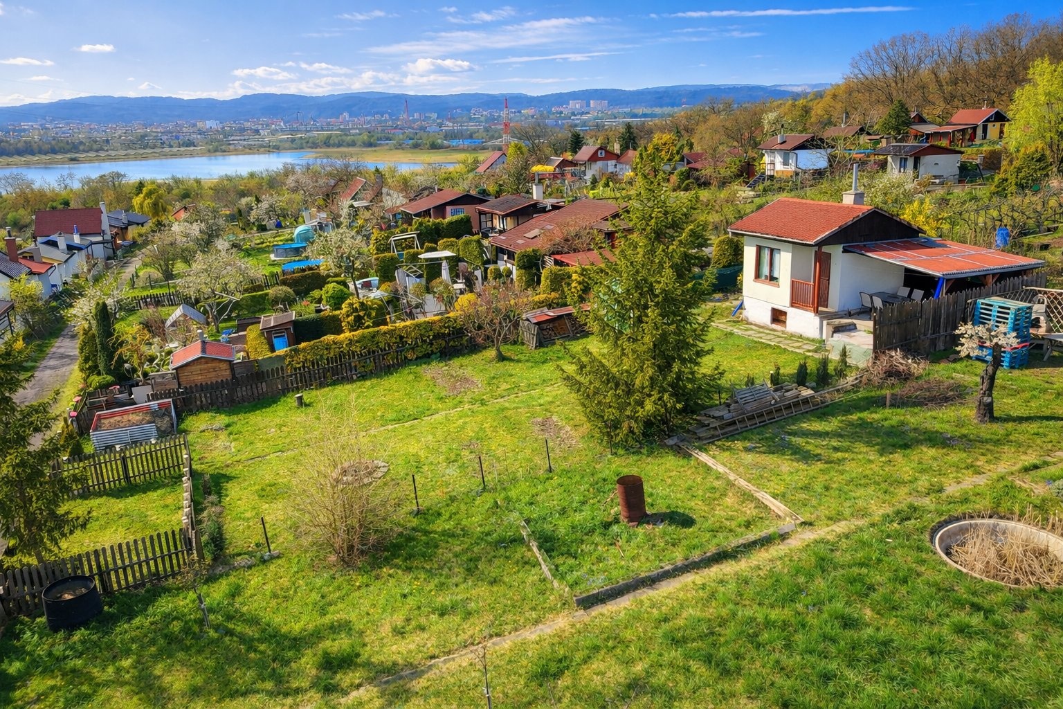 Pozemek je celý oplocený, nachází se na slunném svahu a během dne je zde opravdu dostatek slunce. Vedle chatky najdete zastřešené posezení, z druhé strany pak WC (chemické). K dispozici je také ohniště, plechová kůlna na nářadí a kompost.