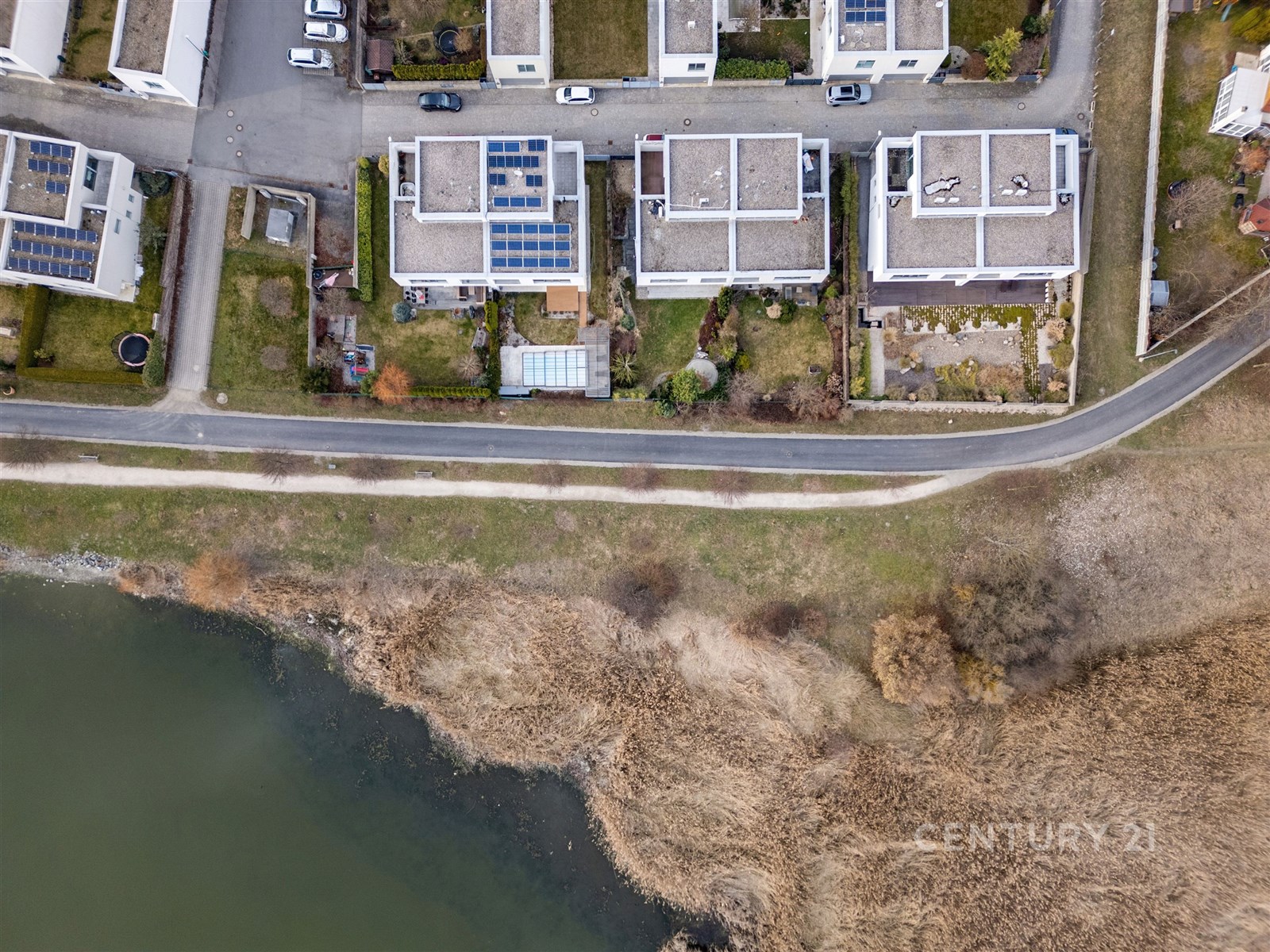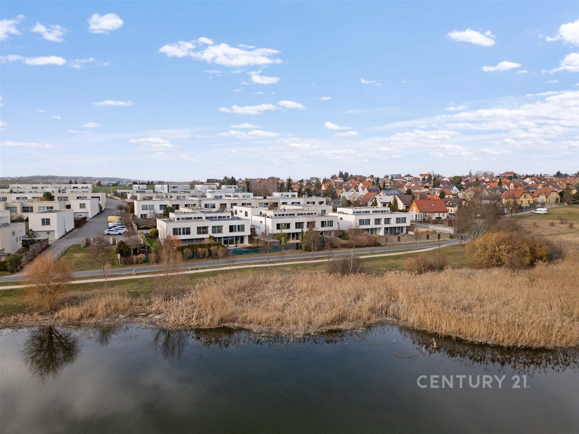 Dům se nachází na nejprestižnější adrese známého projektu rodinných domů Terasy Unhošť, stojí hned v jeho první linii v ulici Terasy V s otevřenými výhledy na rybník a do zeleně. Dům je dvoupodlažní, respektive originálně navržený jako "zigzag" s mezipatrem. Srdcem domu je velkoryse řešený obývací prostor s krbem na dříví a kuchyní nádherně prosvětlený díky velkoformátovým hliníkovým oknům po celé délce stěny, které umožňují přímý vstup na zahradu přes slunnou terasu a široké výhledy do bohaté zeleně přes zahradu a rybník do dáli. Po pár schodech se dostanete do mezipatra, kde jsou vedle sebe umístěné 3 téměř stejně velké pokoje s okny směřujícími do zahrady, jeden z nich s balkónem. Dále jsou v mezipatře 2 koupelny se sanitou značky Duravit a Sapho, jedna velká s vanou a sprchovým koutem po celé šíři koupelny, druhá s vanou a toaletou. U vstupu do domu se nachází další samostatná toaleta pro návštěvy. V nejvyšší úrovni domu se ukrývá ložnice s walkin šatnou a přímým vstupem na terasu, která nabízí úplné soukromí, ideální prostor pro umístění vířivky a odpočinkových lehátek. Zahrada je osazena keři a menšími stromy, je navržená jako bezúdržbová, s automatickým zavlažováním ovládaným na dálku a díky rovinatému povrchu se o sekání trávy postará robotická sekačka. Na procházku k rybníku je to z domu pouhých pár kroků díky vstupu přes uzamykatelnou branku přímo ze zahrady.