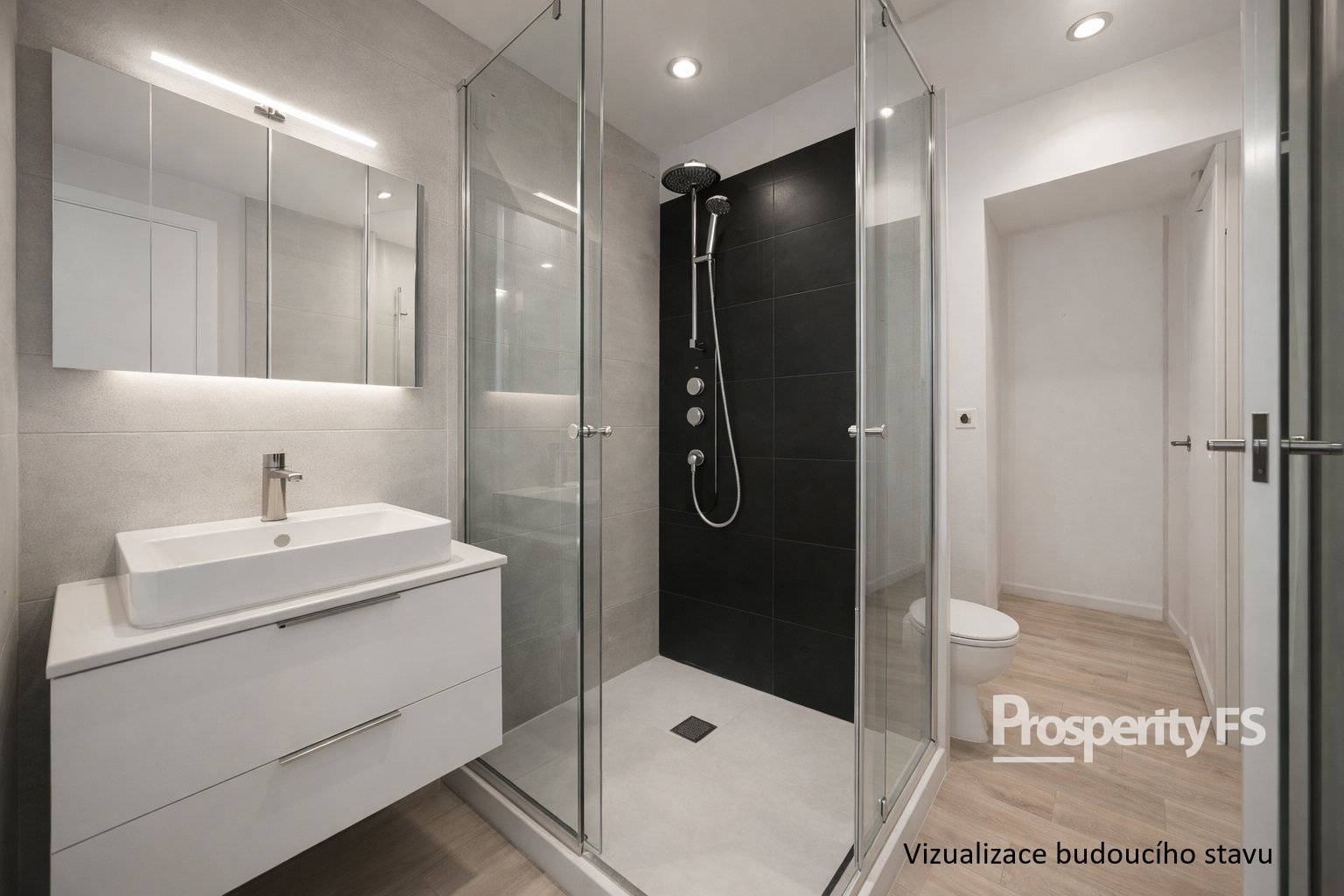 Koupelna je připravena ke kompletní modernizaci a byt dále nabízí praktický úložný prostor v podobě zděné šatny.