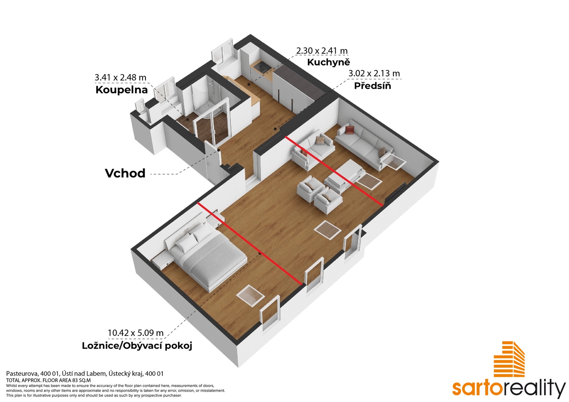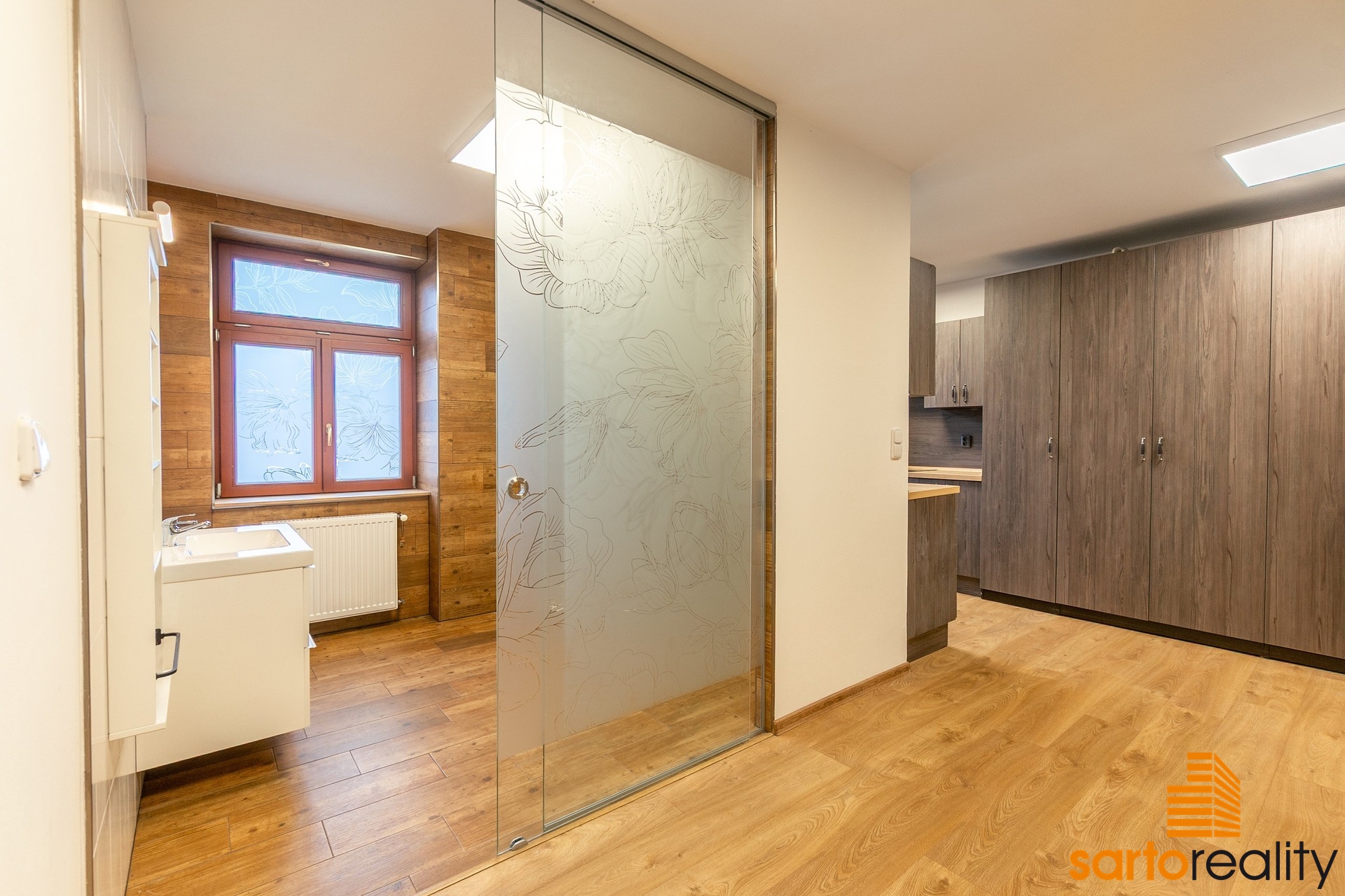 Při rekonstrukci, včetně těch zásadních instalací jako jsou nové rozvody elektra, topného systému, vodoinstalací a zateplení, zde byly položeny podlahové krytiny, osazen moderní plynový kondenzační kotel Wiessmann, zrenovovány přiznané trámové konstrukce a SDK podhledy aj. Dále zde najdete prostornou koupelnu s WC a sprchovým koutem, které dominuje designová prosklená zašupovací stěna. Okna jsou převážně dřevěná + střešní. K vyššímu standardu dnes patří i elektronické zabezpečovací zařízení. Na míru zhotovená kuchyňská linka je včetně vestavěných spotřebičů - sklokeramic. deska Gorenje, myčka Indesit, horkovzdušná trouba aj. Hlavní obytný prostor bytu je orientován na západ, pohledem na univerzitní kampus UJEP, koupelna a kuchyně jsou orientovány na východ do vnitrobloku.