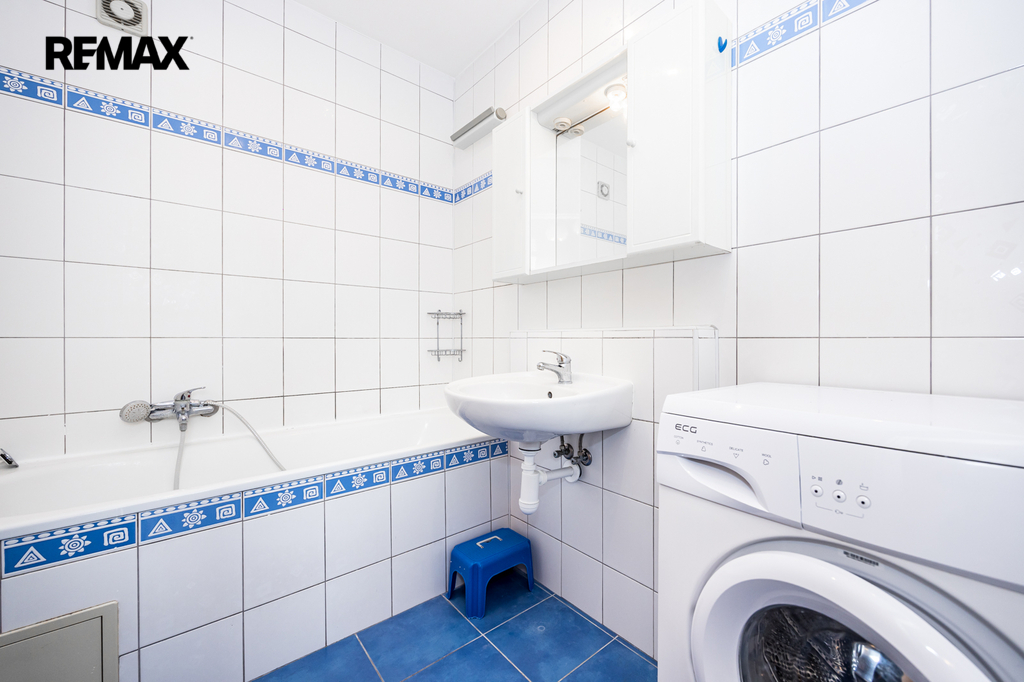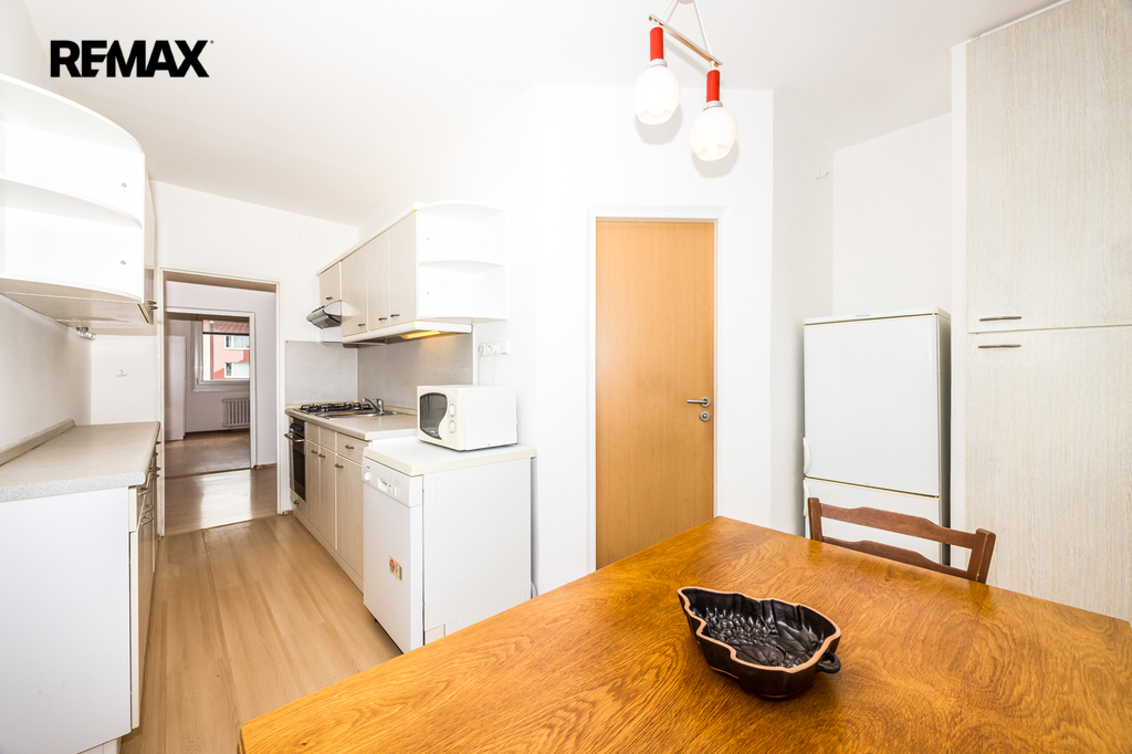Byt je ve velmi dobrém stavu. Bytové jádro je zděné, samostatná toaleta s přístupem z předsíně, v bytě je velká šatna (komora) pro uložení věcí. V kuchyni je kuchyňská linka s plynovým sporákem a myčkou nádobí (60 cm). K dispozici je kombinovaná lednice a automatická pračka (na fotografiích v inzerci).