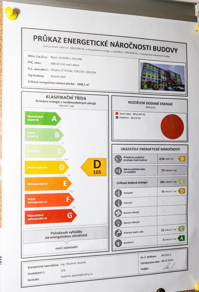 - Ukazatel energetické náročnosti budovy: 105 kWh/m²