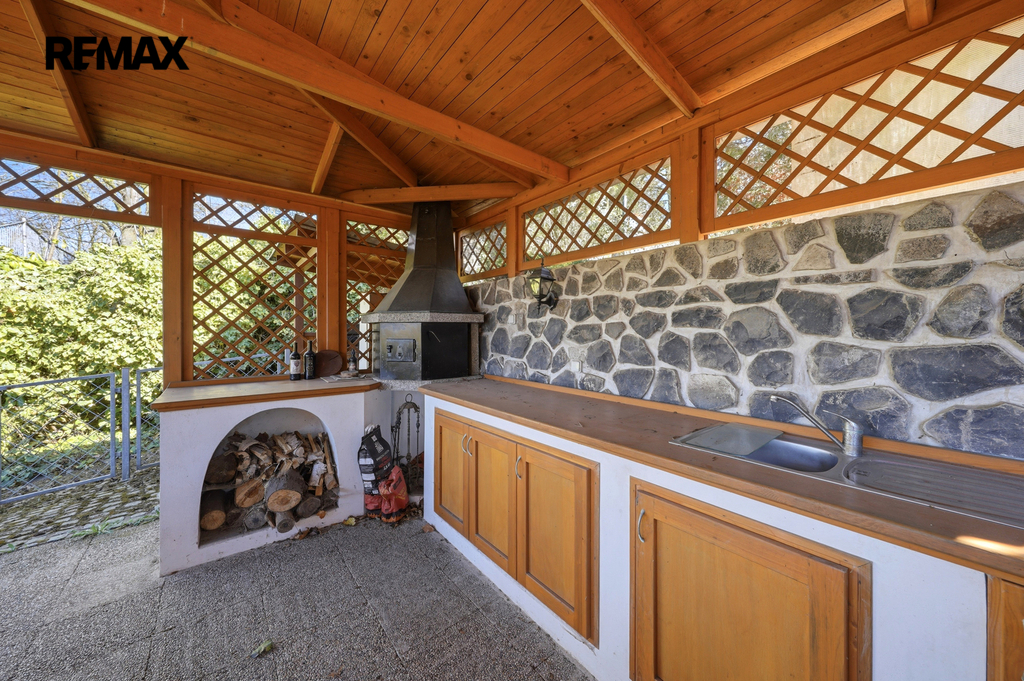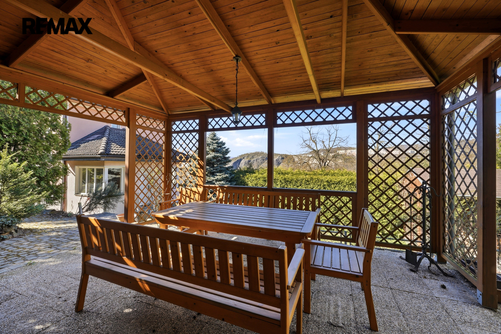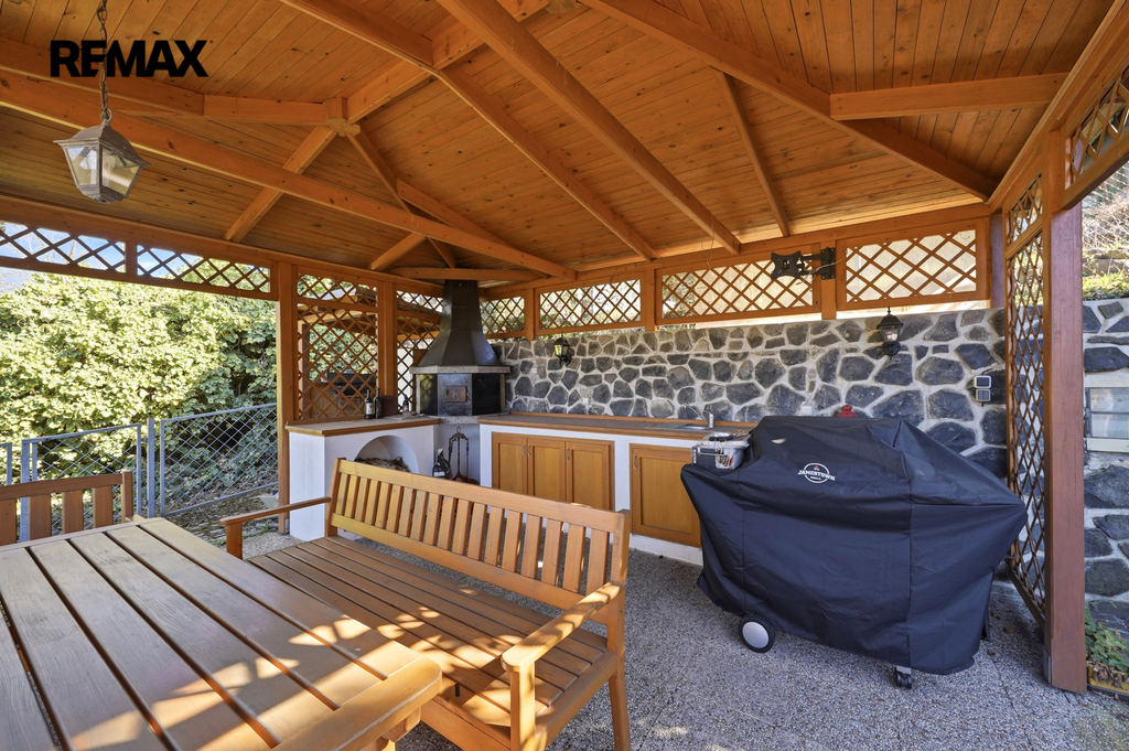 Terasa před vstupem do domu i letní zahradní altán s kuchyní a krbem nabízí fantastický výhled na Labské údolí a Mariánskou skálu a klidné posezení s rodinou i přáteli.