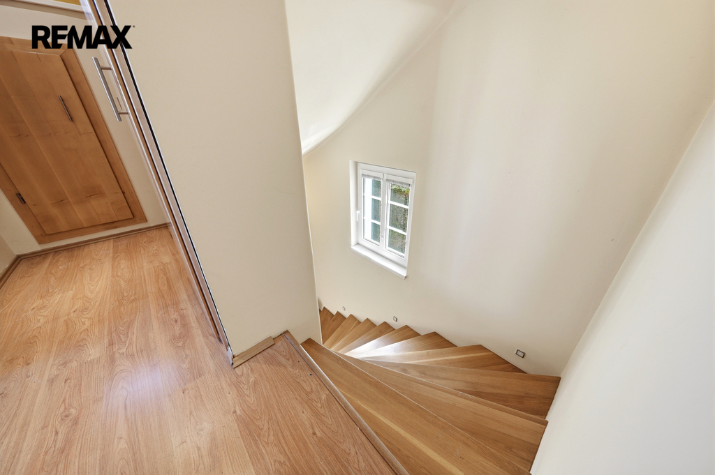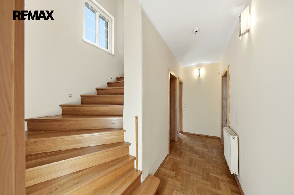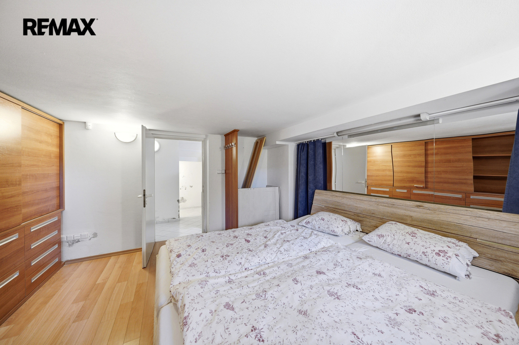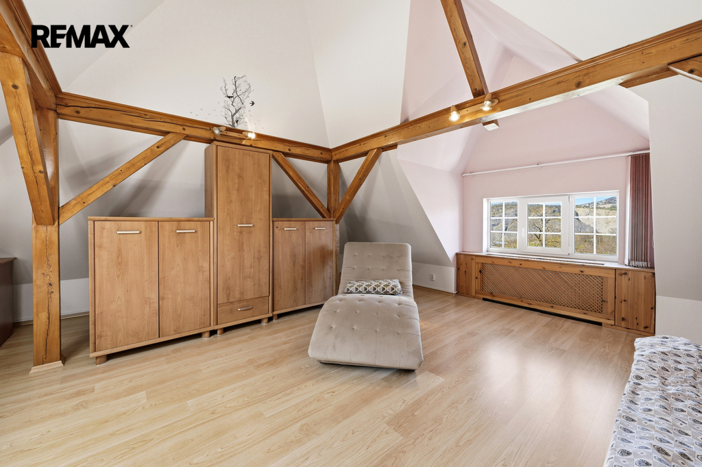 Podkroví – velký obytný prostor/pokoj (33,5 m2), díky zajímavým dřevěným prvkům a šikminám má podkroví příjemnou atmosféru a velký potenciál.